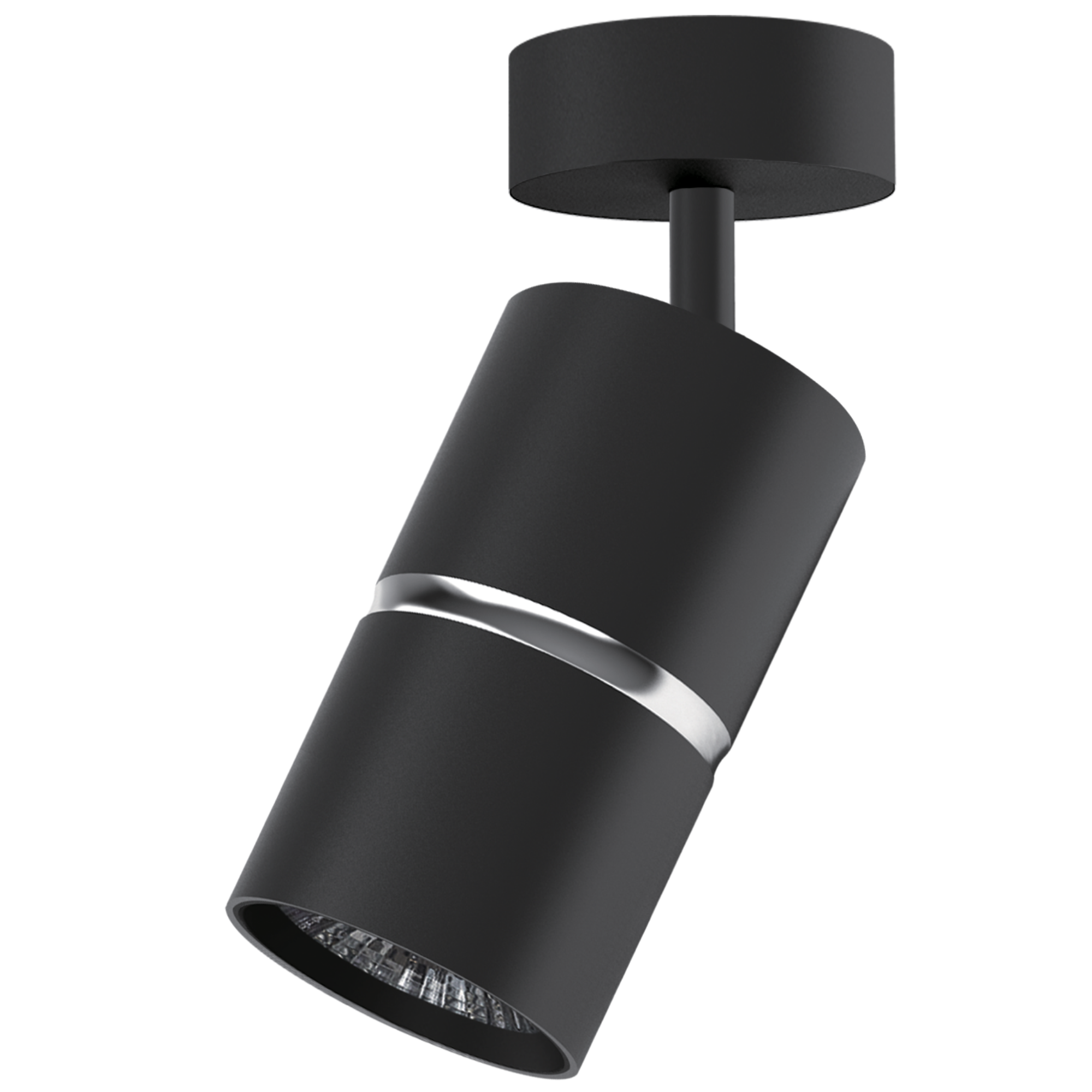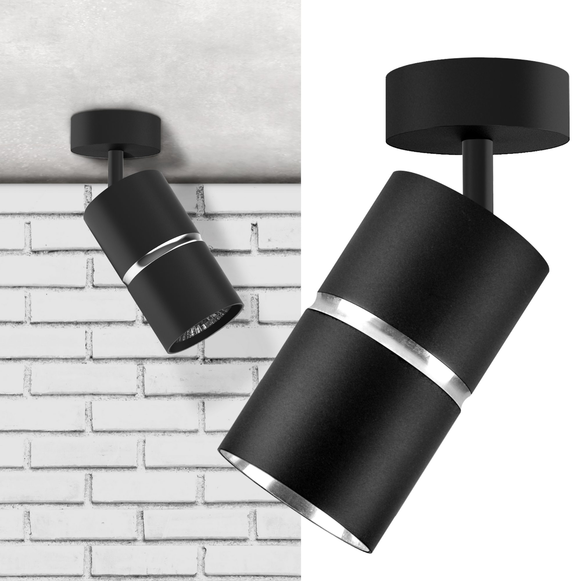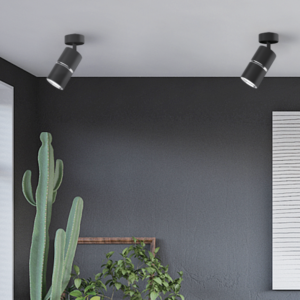 BAMBOO to nowoczesna oprawa, spot ścienno-sufitowy z wymiennym źródłem światła, wykonana z aluminium w kolorze czarnym, oraz srebrnym pierścieniem pośrodku oprawy.