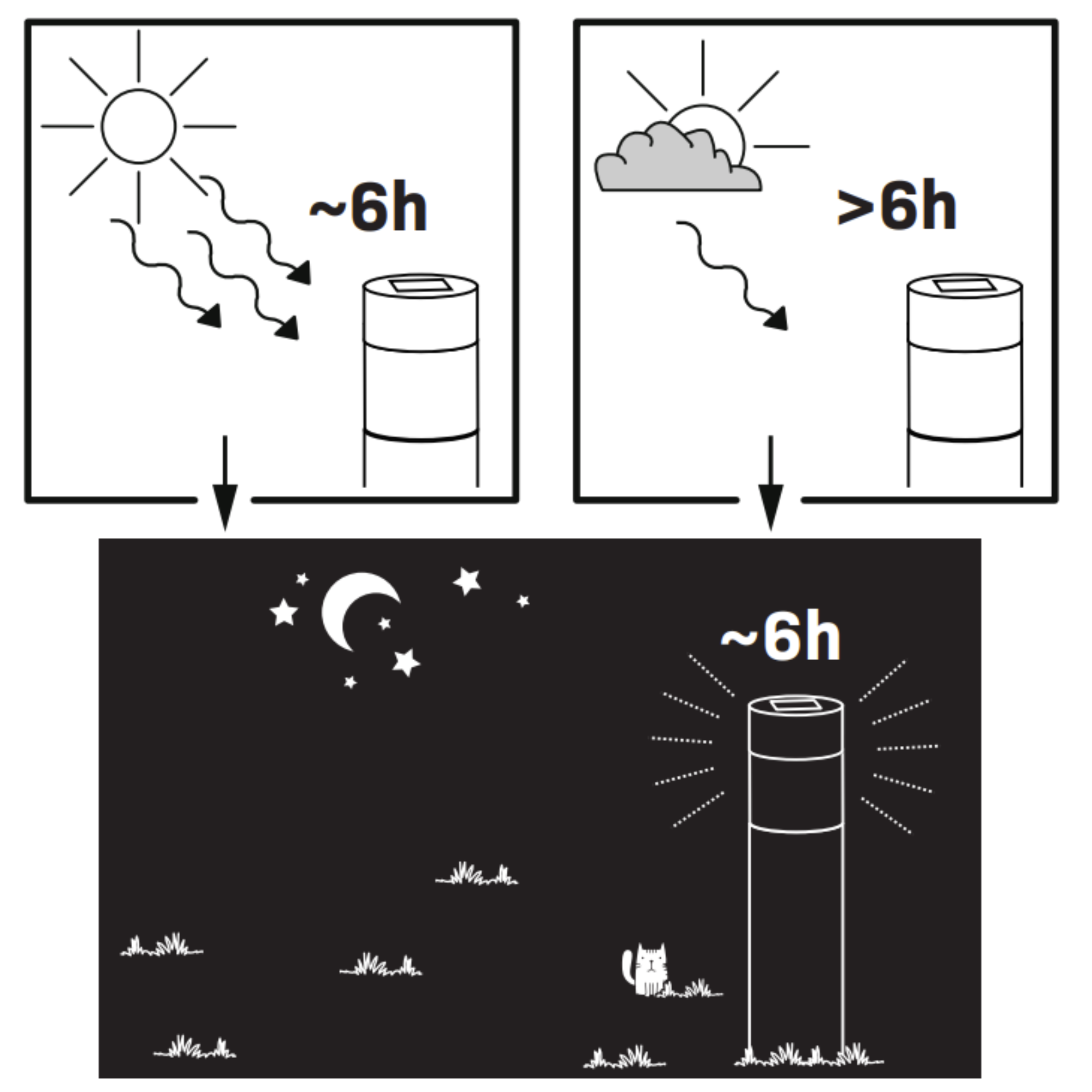 • Czas świecenia po całkowitym naładowaniu akumulatora: max 6h, (mierzono latem, akumulator ładowany w warunkach słonecznej pogody w ciągu dnia)