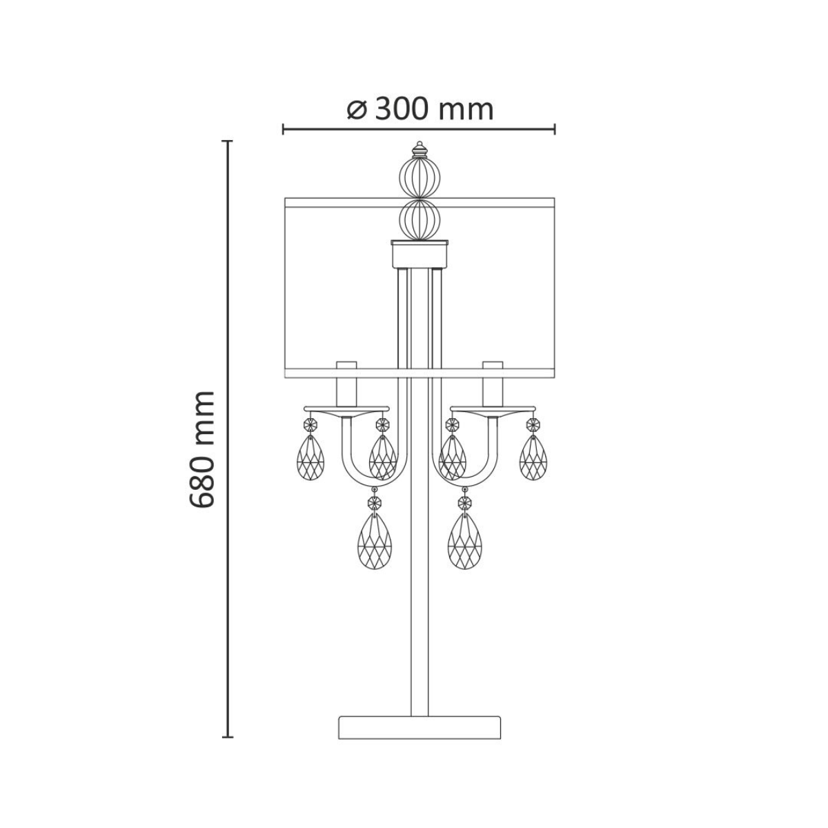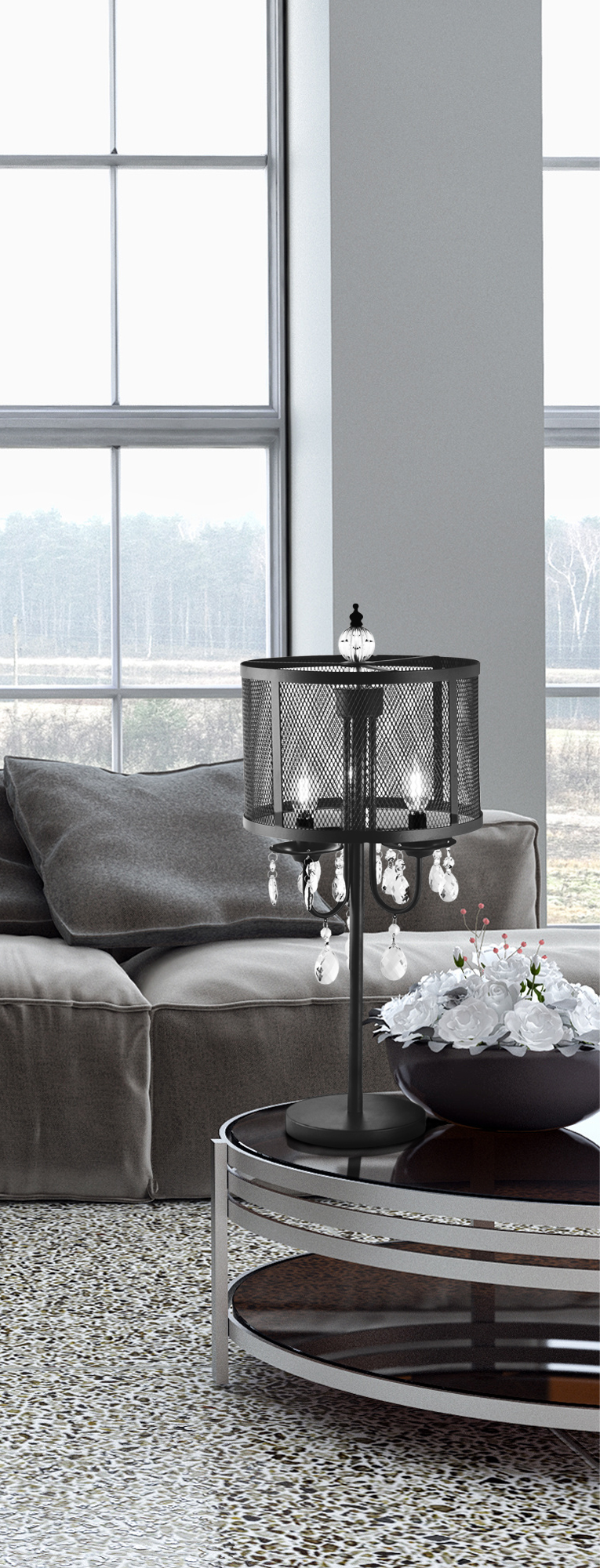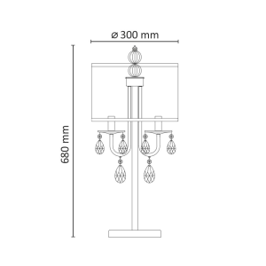 Lampa została wykonana z metalu w kolorze czarnym z kloszem z cieniutkich drucików wykończonym metalowymi obręczami. Lampę ozdabiają zawieszone transparentne kryształki.