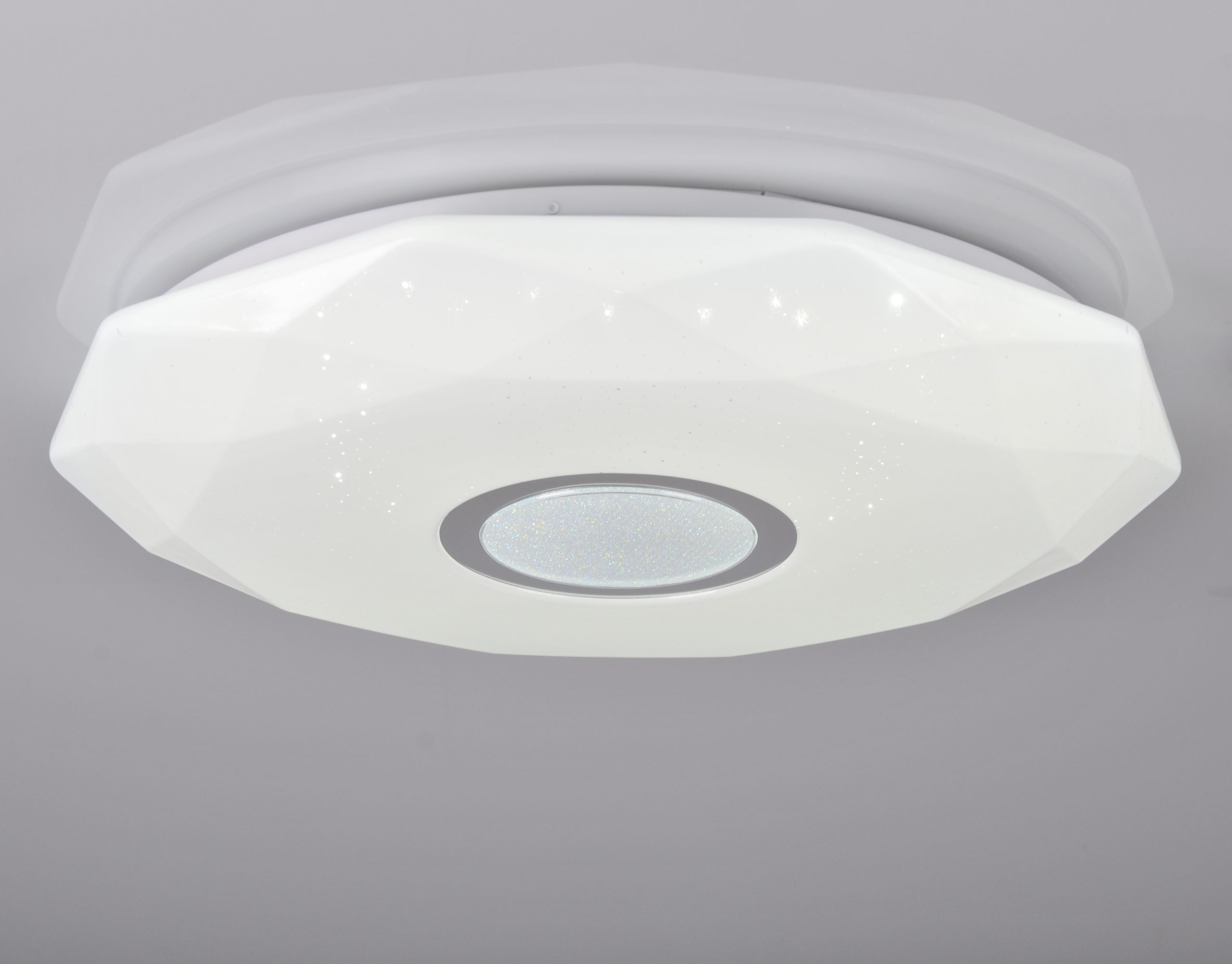 Mleczny klosz wspaniale rozprasza światło, dzięki czemu lampa świeci równomiernie na całej powierzchni, nie występuje efekt świecenia punktowego, czy zaciemnionego miejsca z jednej strony (jak w przypadku tradycyjnych plafonów z wkręcaną żarówką), nie powodując tym samym efektu olśnienia.