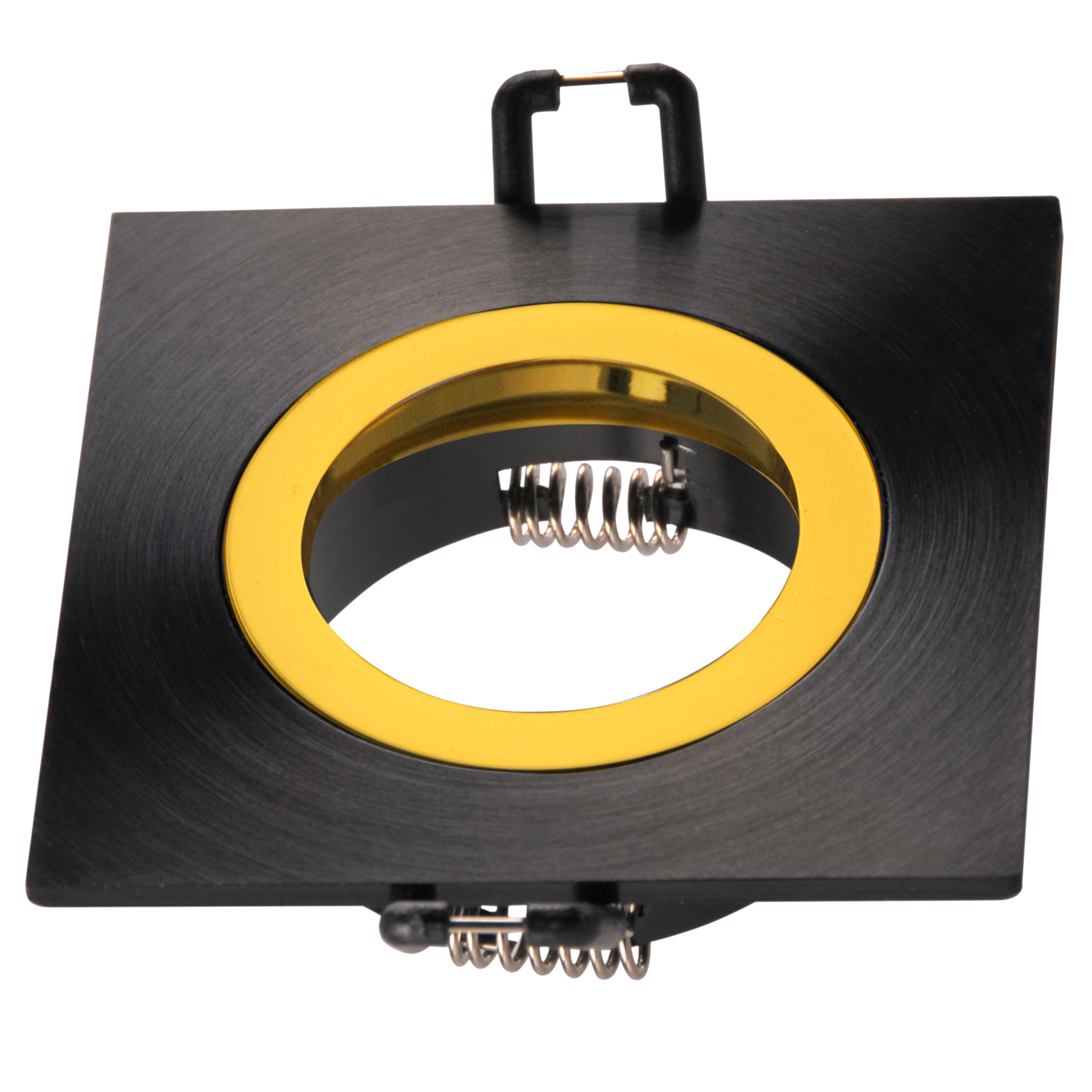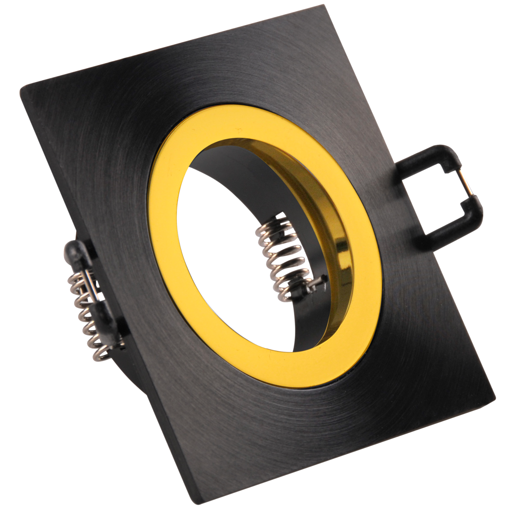 Punktowa, podtynkowa stała oprawa oświetleniowa wykonana z aluminium w kolorze czarnym ze złotym pierścieniem.