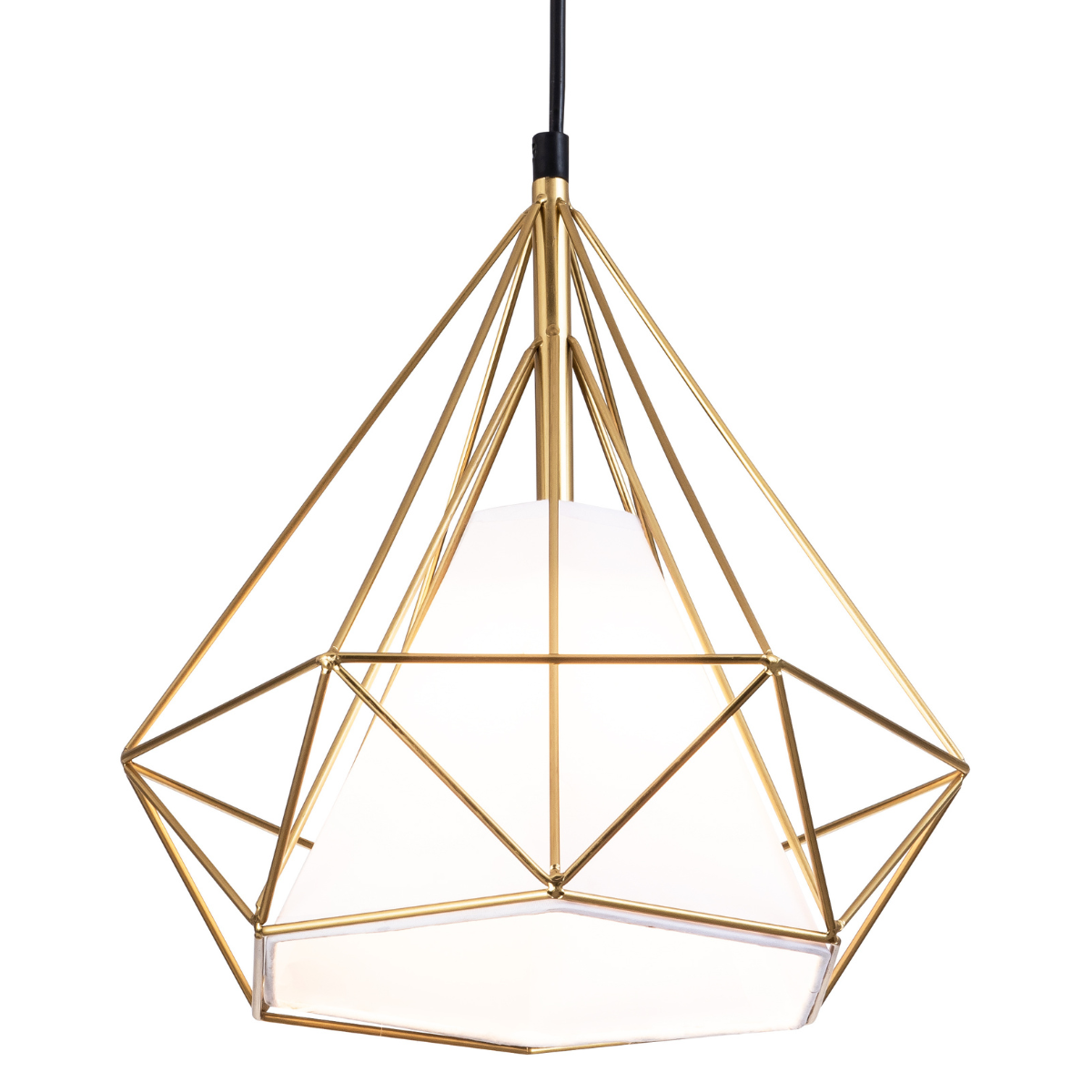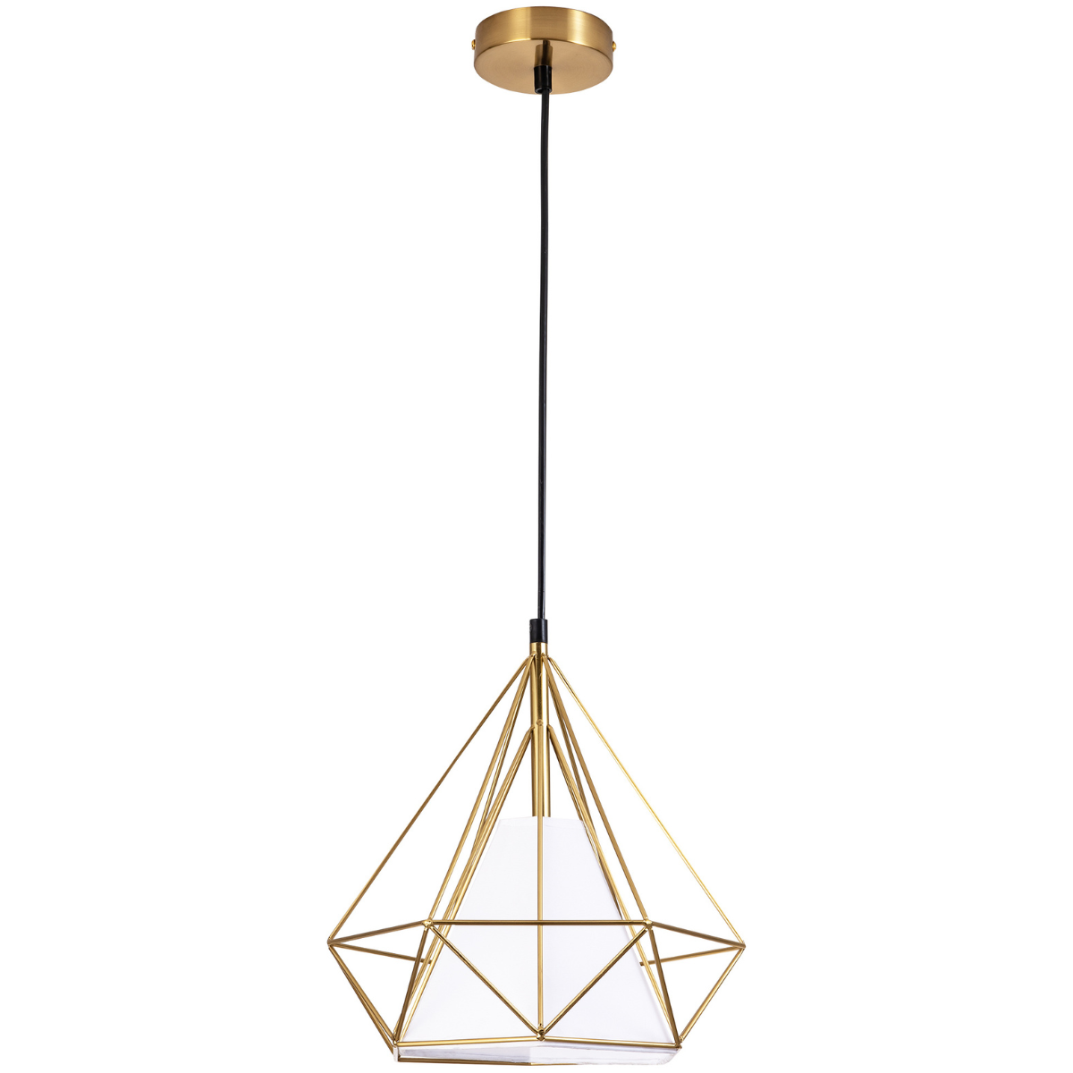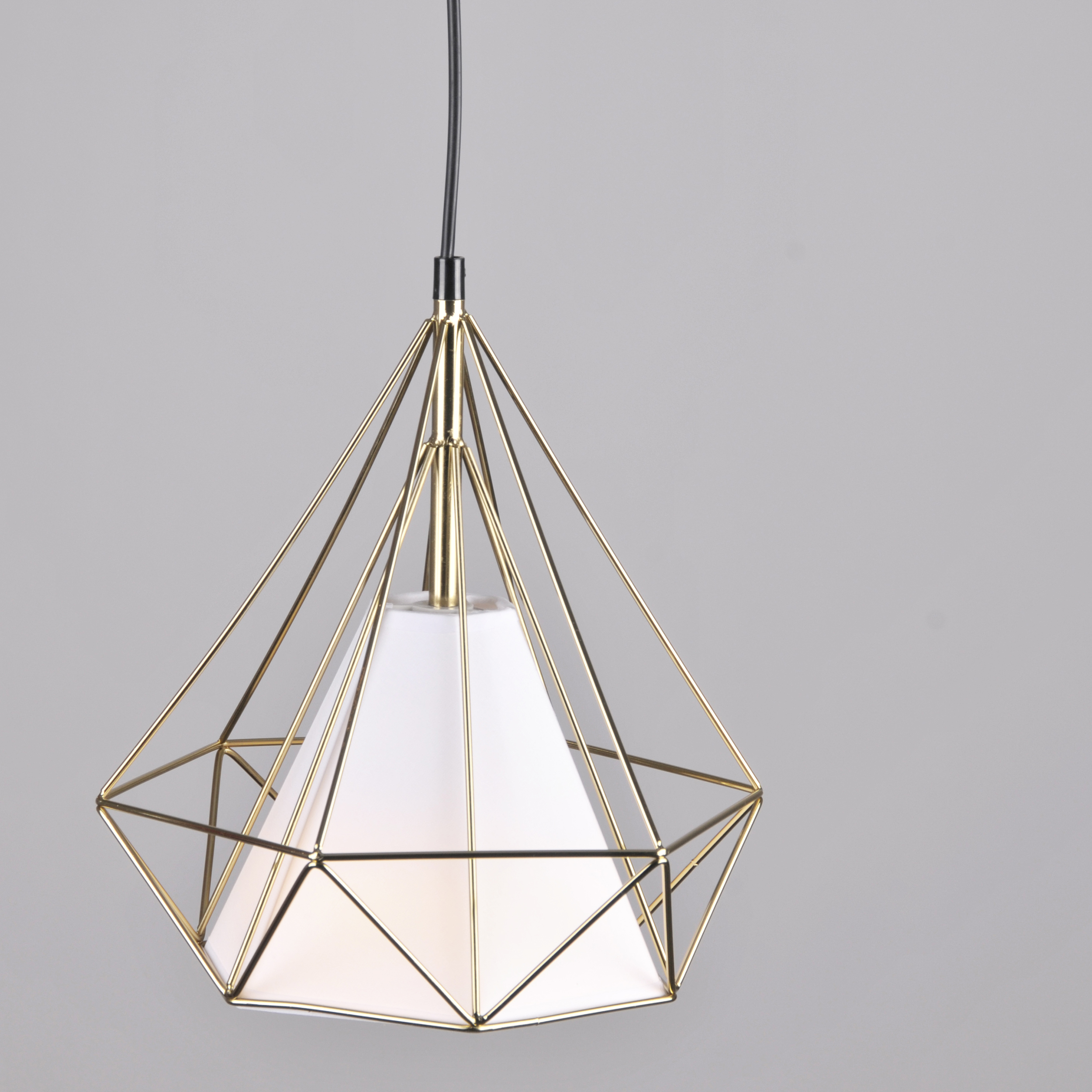 Ozdobny klosz, którego kształt przywodzi na myśl połączenie figur geometrycznych – podkreśla prostotę i minimalizm, a złoty kolor ozdobnej, zewnętrznej jego części w przyjemny sposób buduje kontrast.
