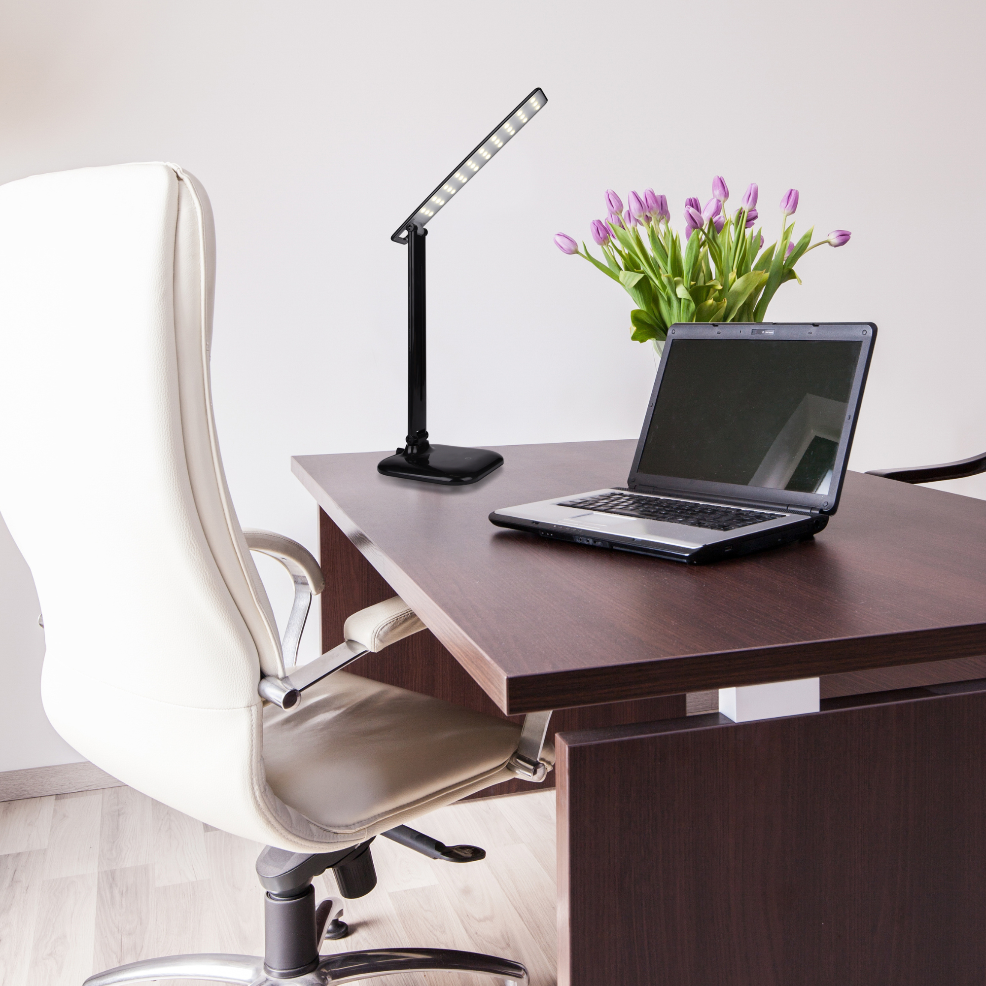 Nowoczesna lampka biurkowa LED wykonana z tworzywa sztucznego przeznaczona do zastosowań mieszkaniowych.