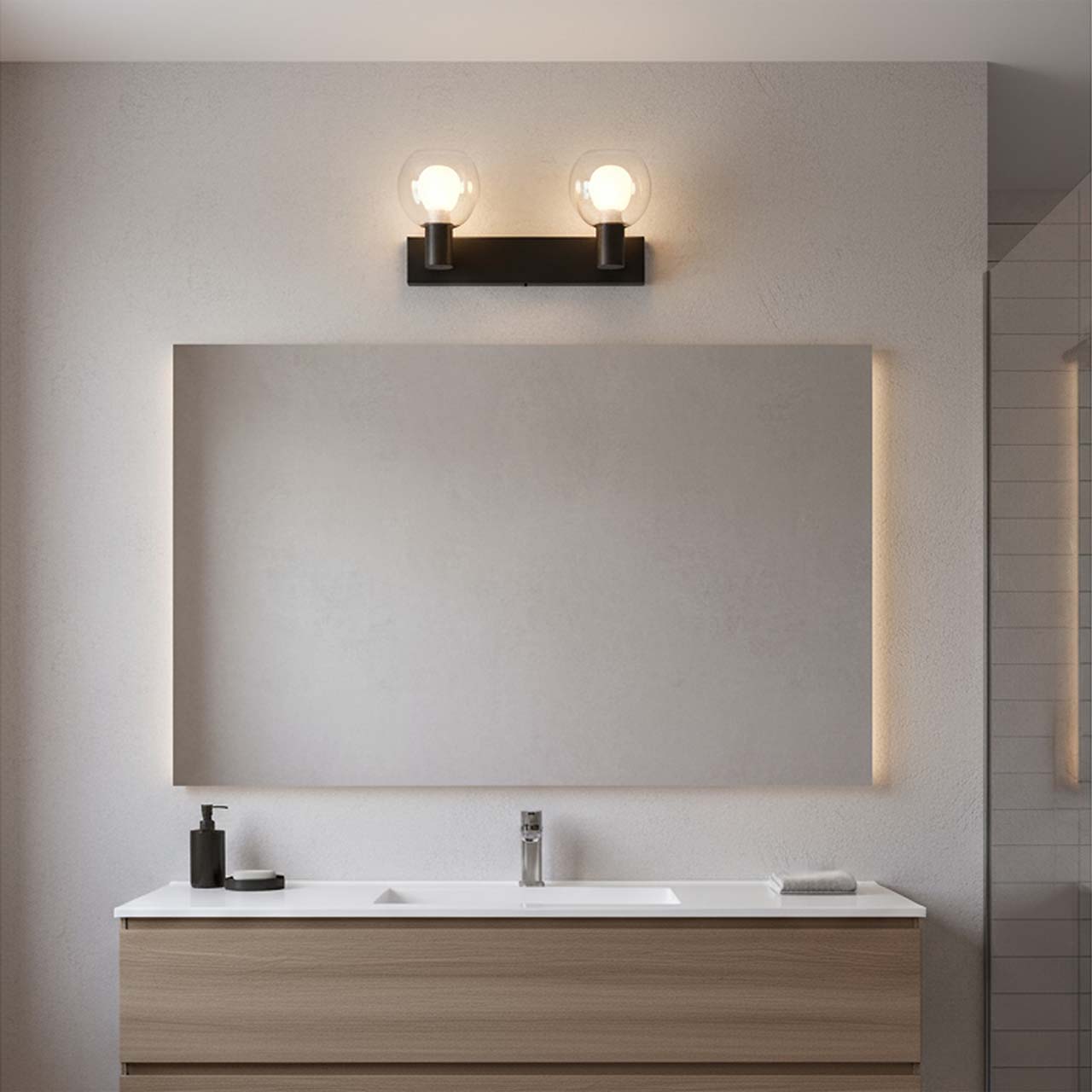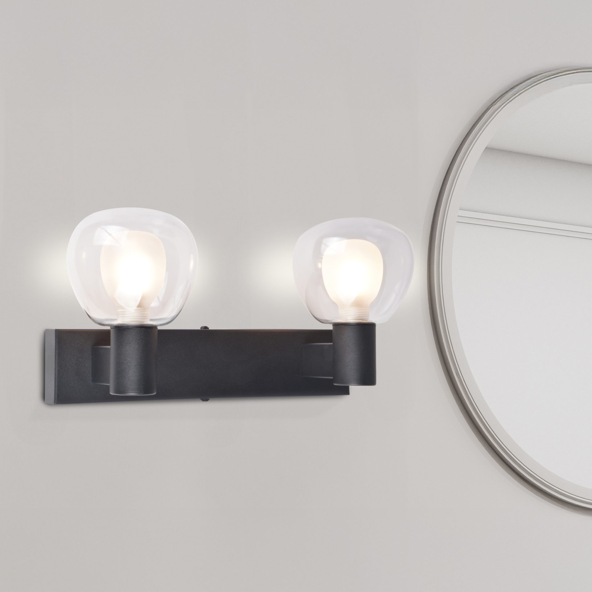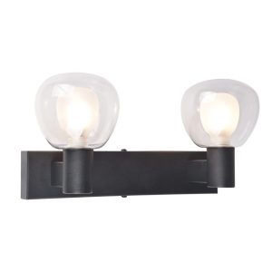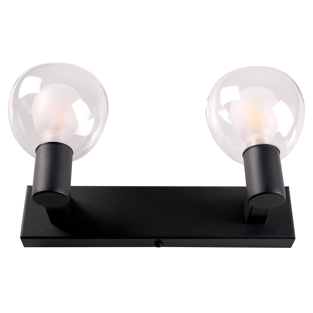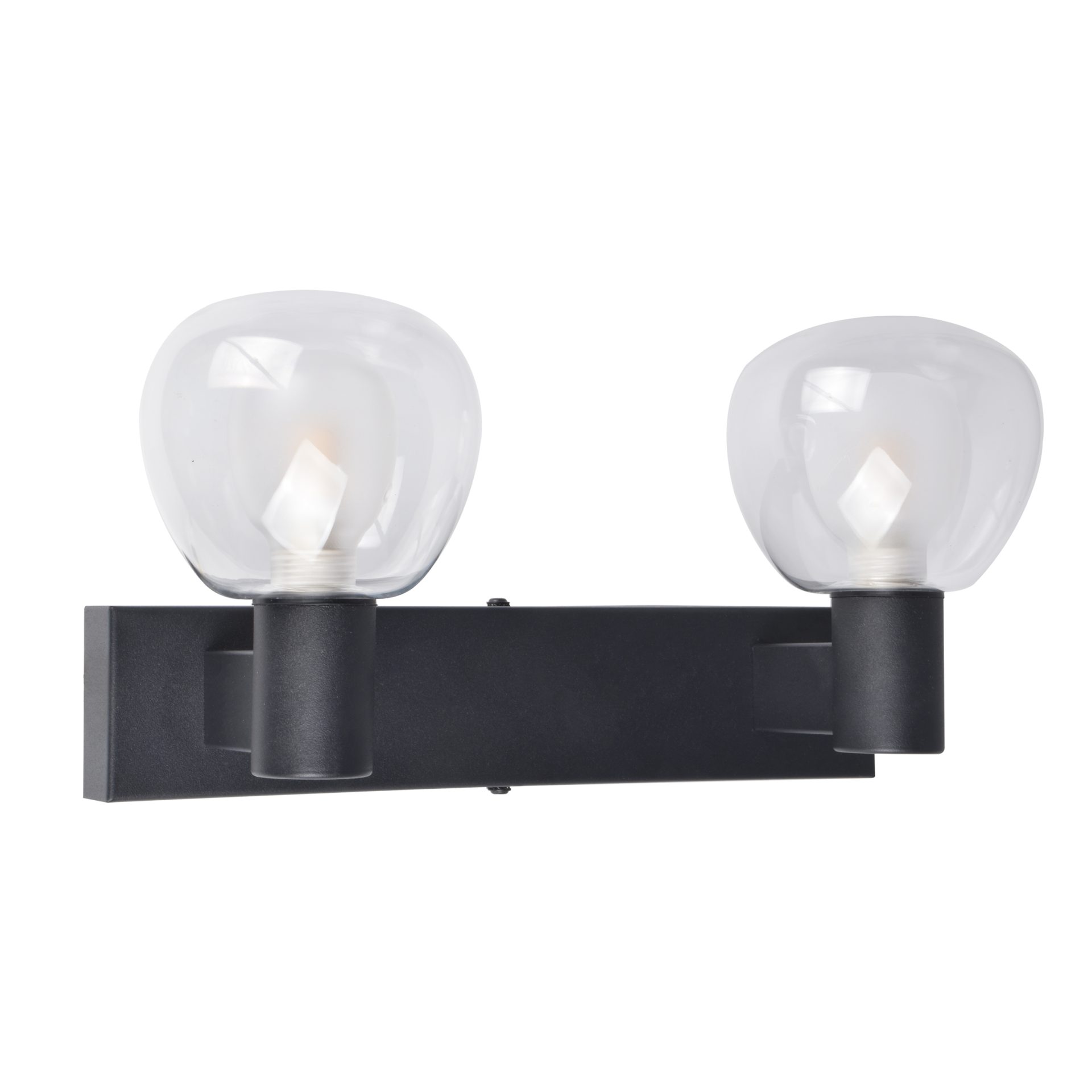 Kinkiet POLA 2 to stylowa oprawa ścienna z dwoma transparentnymi, szklanymi kloszami na czarnej podstawie.
