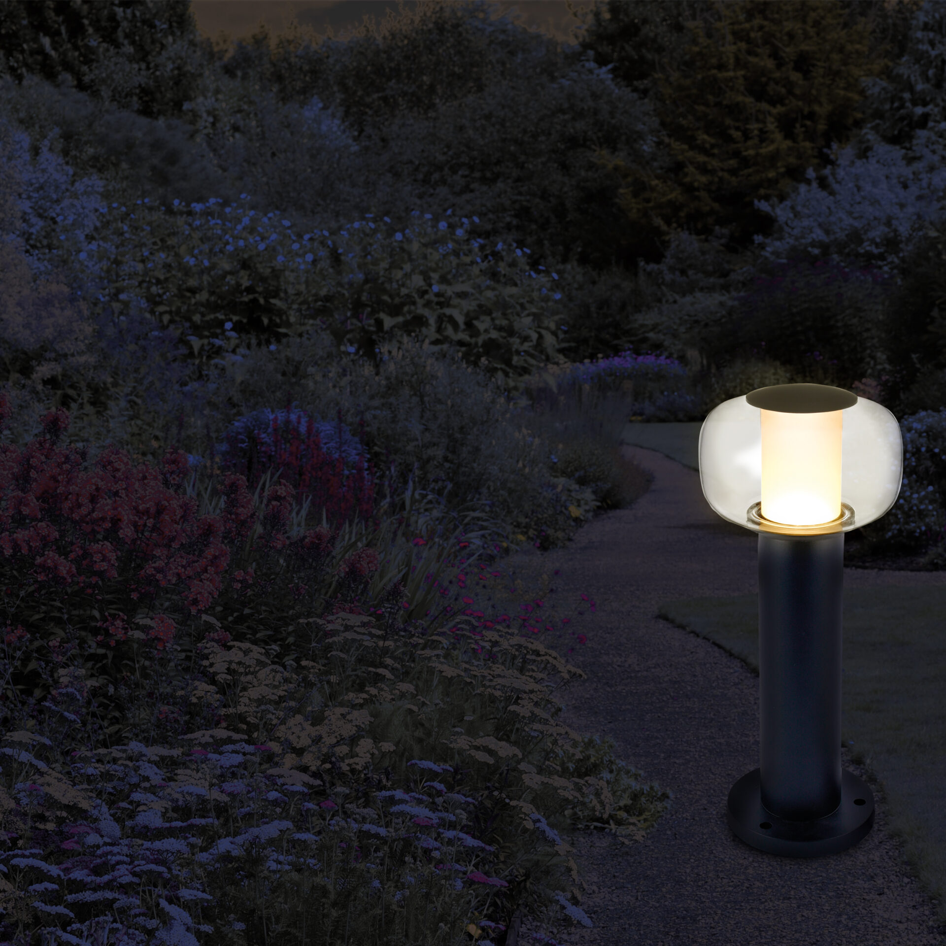 Lampa o wysokości 40 cm, wykonana została z wysokiej jakości materiałów. Czarne aluminium, oraz biały szklany klosz doskonale podkreśli urok Twojej przestrzeni na zewnątrz.