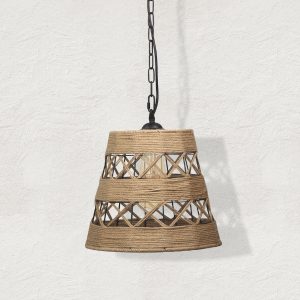 Lampa ALMA ROPE to zwis o uniwersalnym charakterze. Klosz wykonany z czarnych, połączonych ze sobą drucików opleciony beżowym sznurkiem idealnie wpasowuje się we wnętrza w stylu boho, rustykalnym oraz vintage. Lampa świetnie będzie wyglądać w salonie, kuchni jak i w sypialni.