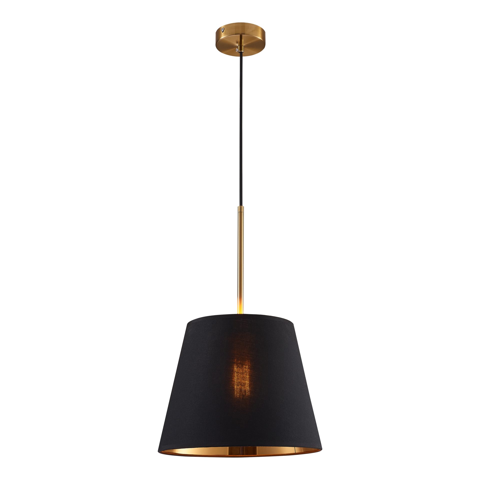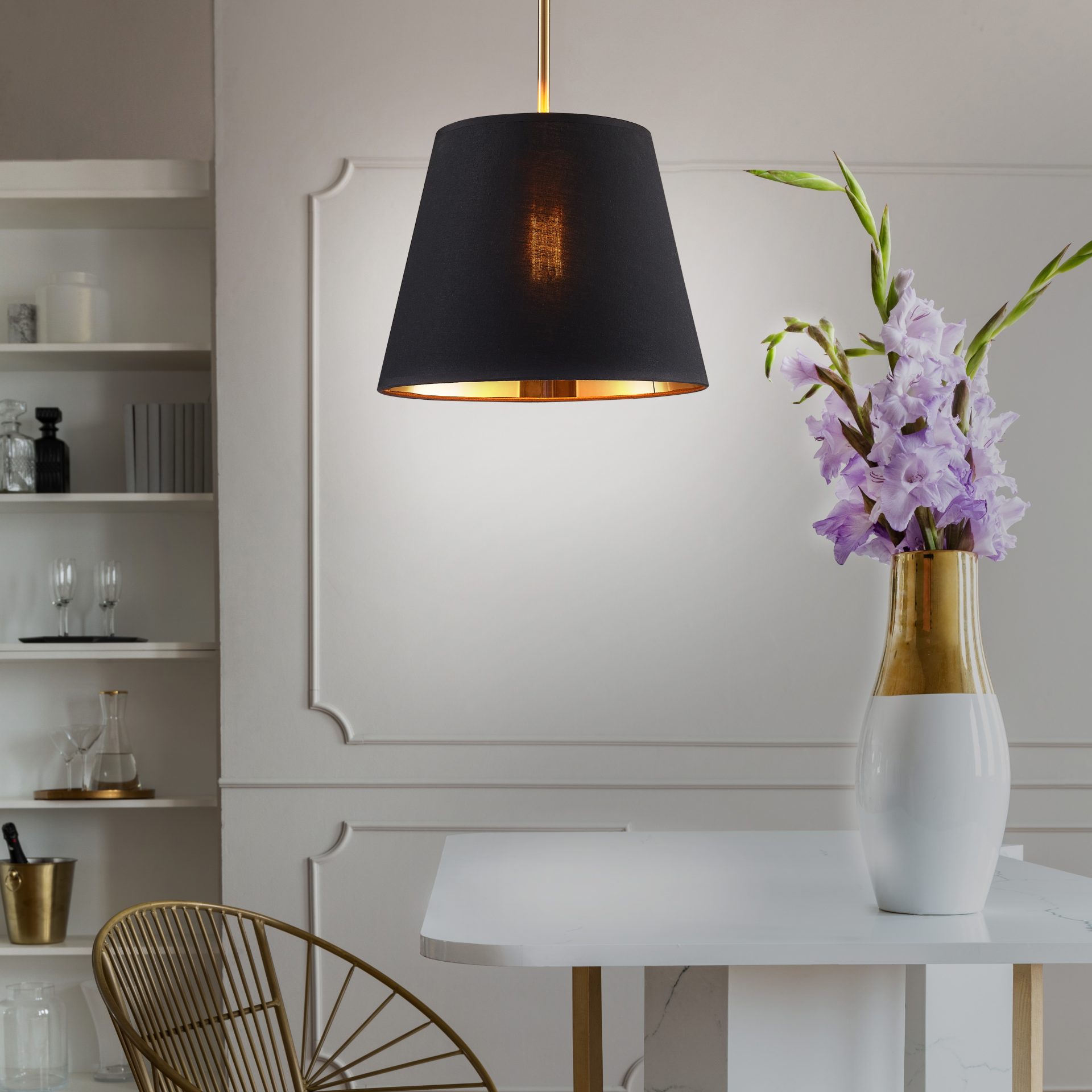 Lampa wisząca ELENA to niezwykle prosta i urocza lampa wisząca w klasycznym wydaniu. Lampa ze złotym wykończeniem oraz czarno-złotym kloszem pięknie prezentować się będzie w salonie, w jadalni nad stołem, czy też sypialni.