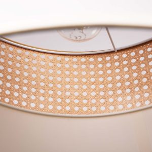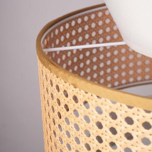 W centralnej części kompozycji znajduje się walec z rattanu, który pięknie rozprasza światło, tworząc miękką i nastrojową iluminację. Dzięki zastosowaniu wymiennej żarówki z trzonkiem E27 można swobodnie dobrać źródło światła – doskonale sprawdzi się żarówka filamentowa, która podkreśli dekoracyjny charakter lampy i wydobędzie urok naturalnych materiałów.