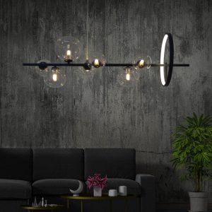 Nowoczesna lampa wisząca HYBRID marki Sanico Goldlux łączy elegancję z funkcjonalnością. Jej wyjątkowa konstrukcja oferuje dwa źródła światła: 7 punktowych kloszy na trzonek G9 w formie przezroczystych kul o różnej średnicy oraz pierścień LED 15W, zapewniający równomierne oświetlenie całej przestrzeni.