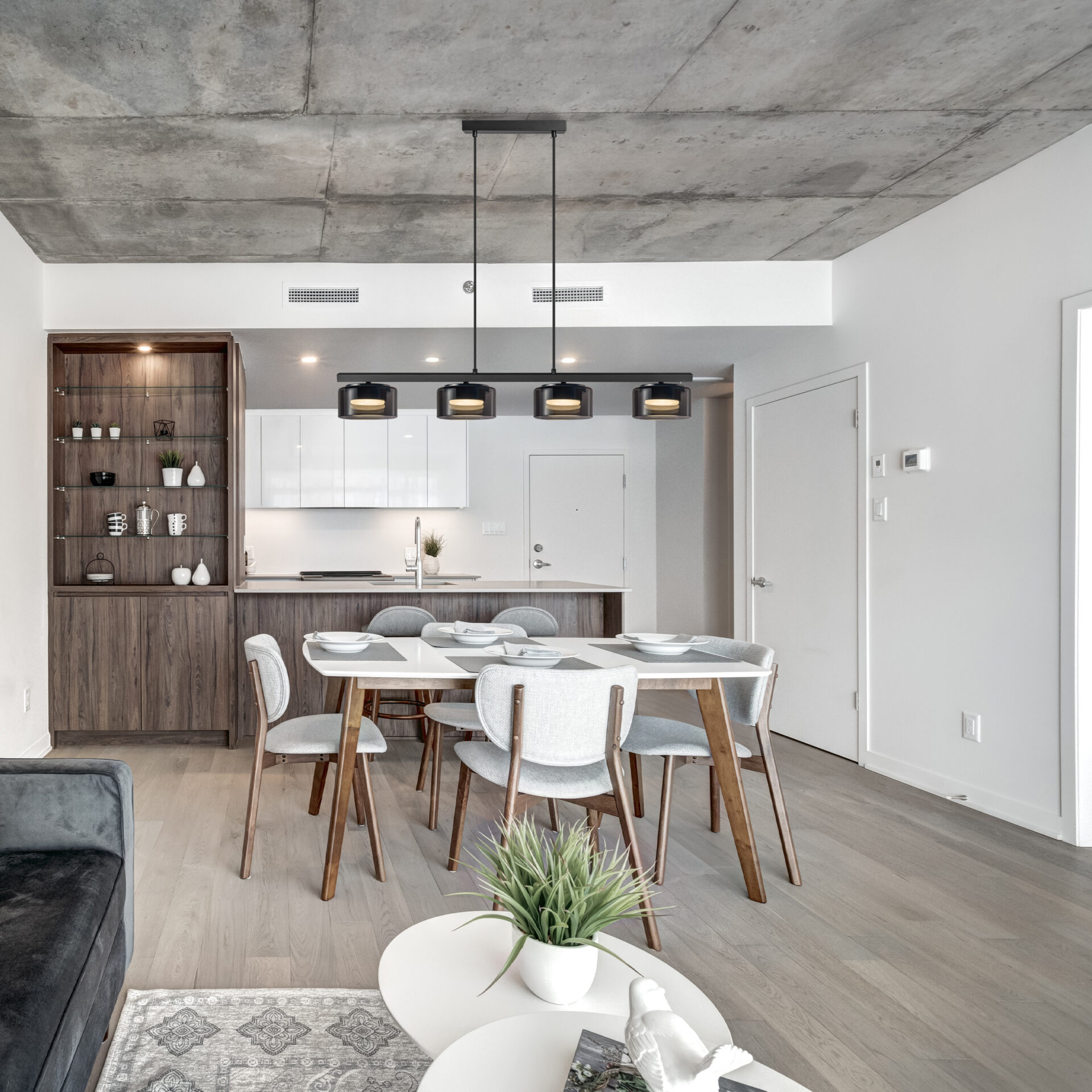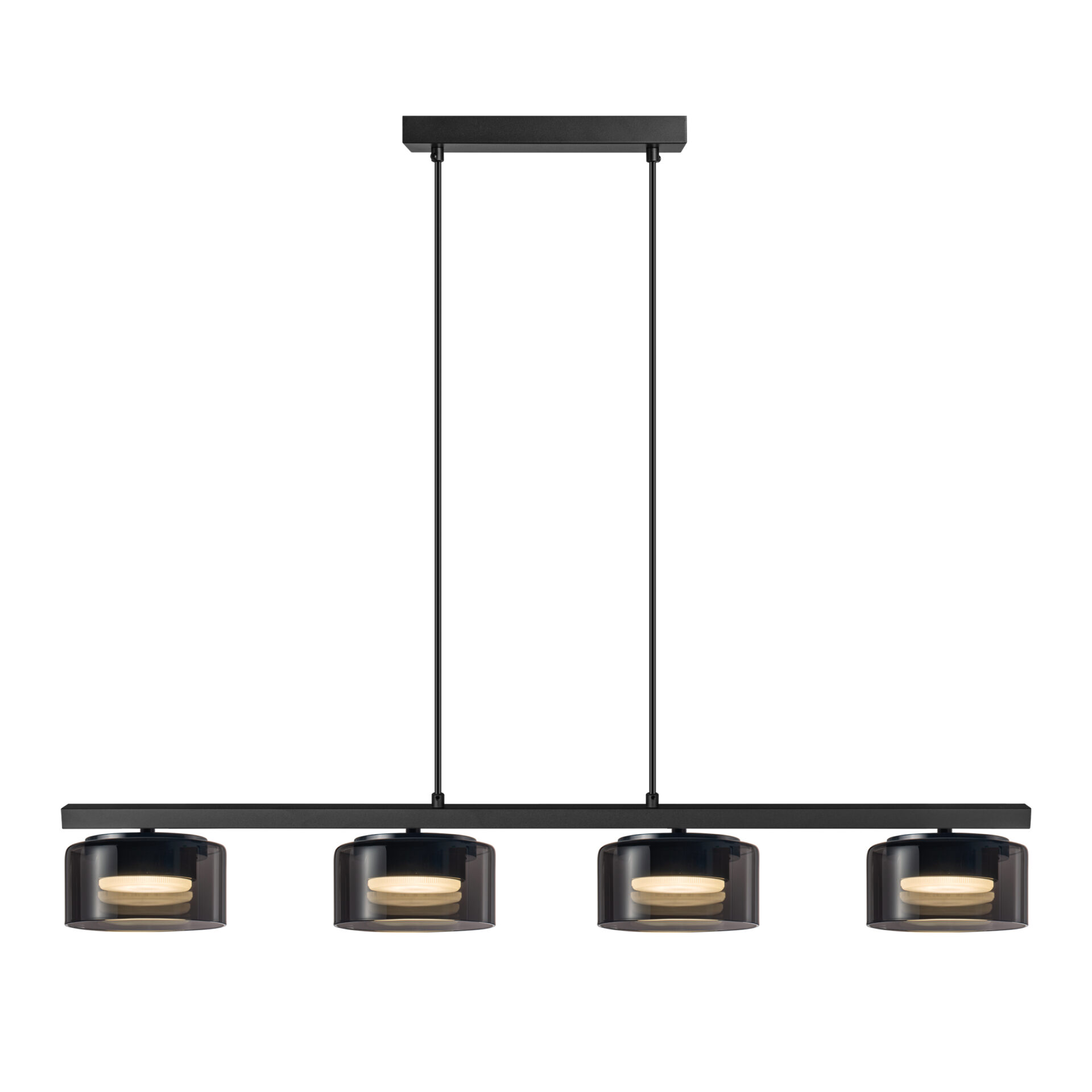 Cztery klosze ze szkła smoky – subtelne przyciemnienie szkła nadaje lampie elegancki, nowoczesny charakter i zapewnia przyjemne, rozproszone światło.