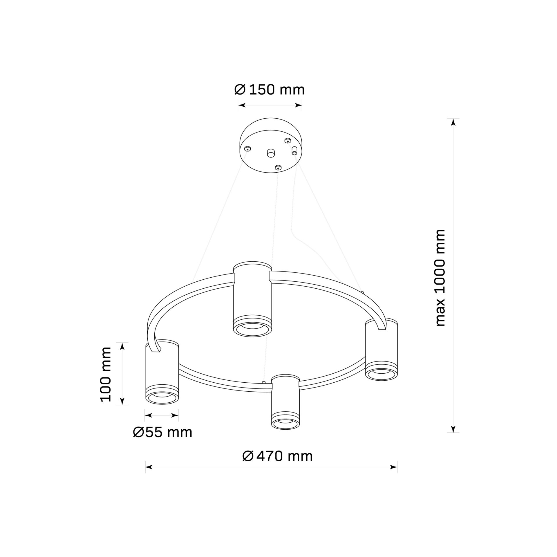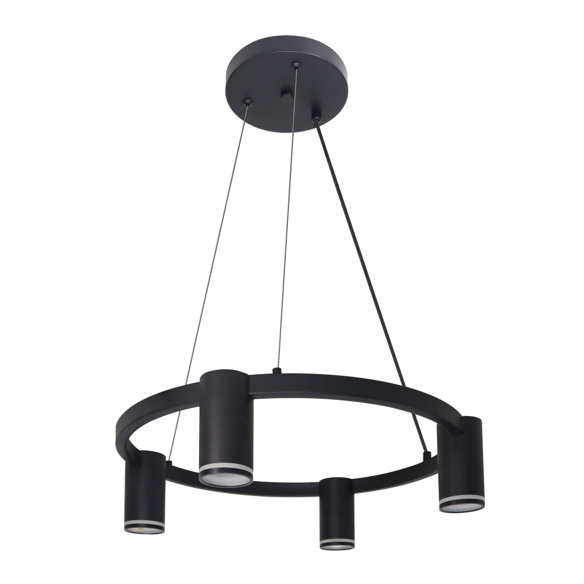 PARIS to czteropunktowa, nowoczesna lampa wisząca z wymiennym źródłem światła, wykonana z aluminium w kolorze czarnym. Elementem dekoracyjnym jest akrylowy odkręcany pierścień w każdej oprawie.