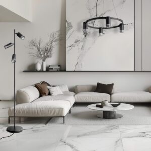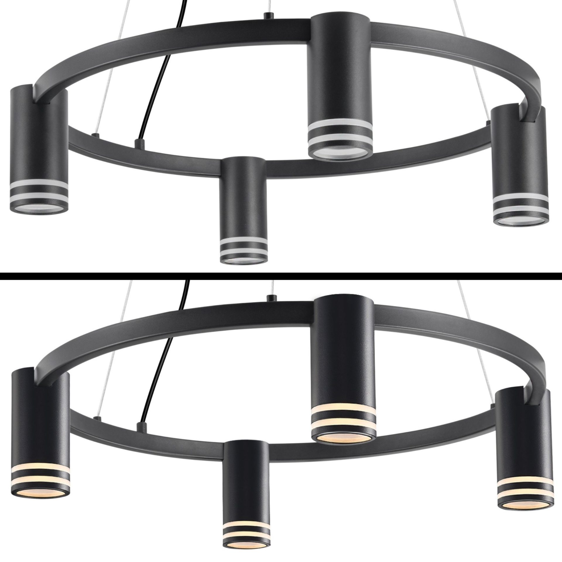 ROMA to czteropunktowa, nowoczesna lampa wisząca z wymiennym źródłem światła, wykonana z aluminium w kolorze czarnym. Elementem dekoracyjnym jest akrylowy odkręcany pierścień w każdej oprawie.