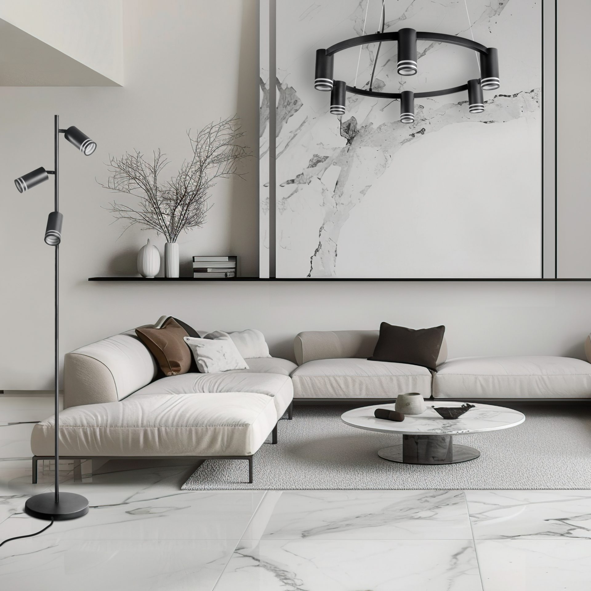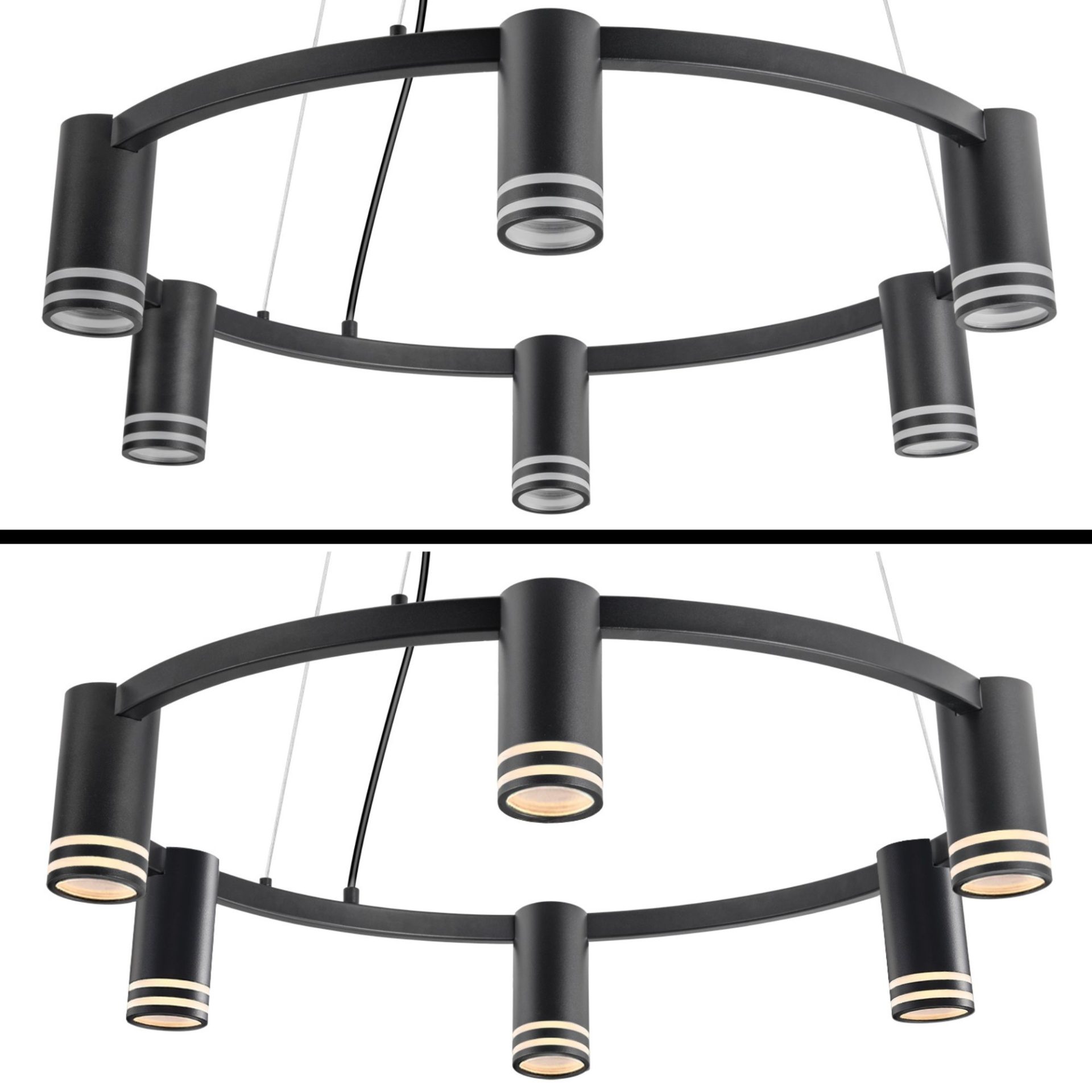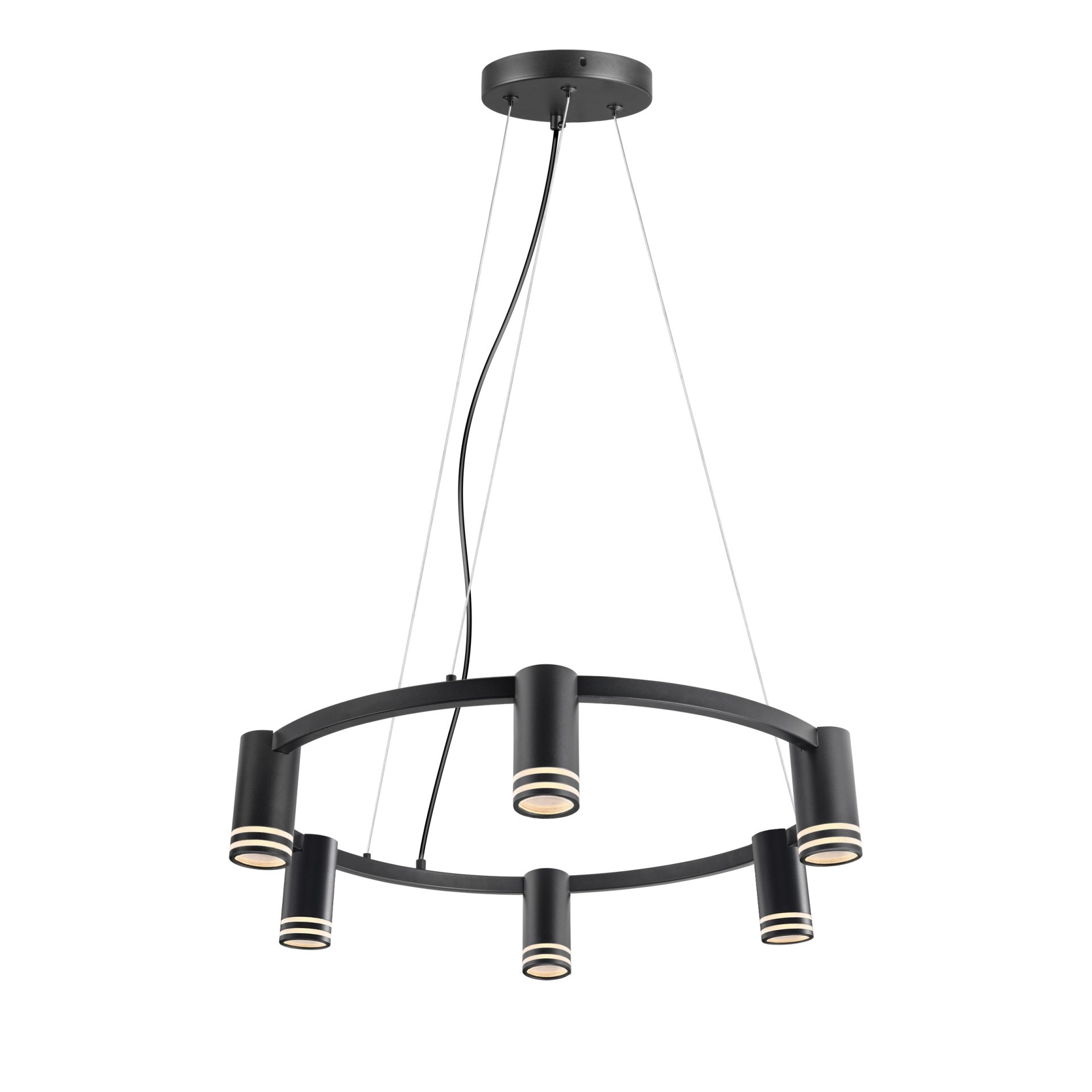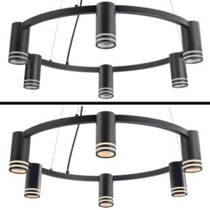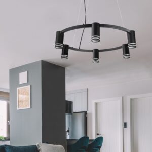 ROMA to sześciopunktowa, nowoczesna lampa wisząca z wymiennym źródłem światła, wykonana z aluminium w kolorze czarnym. Elementem dekoracyjnym jest akrylowy odkręcany pierścień w każdej oprawie.