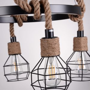 Lampa ROPE ALEGRA została wykonana z czarnego metalu oraz naturalnego sznura konopnego, co nadaje jej niepowtarzalny, surowy charakter. Metalowa obręcz, na której zawieszone są cztery precyzyjnie wykonane klosze z połączonych drucików, tworzy harmonijną kompozycję, łączącą industrialny minimalizm z artystycznym wyrazem. Efekt przeplatania sznura z obręczą podkreśla unikalny styl produktu, czyniąc go idealnym rozwiązaniem do wnętrz urządzonych w stylu loftowym, industrialnym czy nowoczesnym.