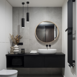 Zewnętrzna czarna matowa powierzchnia lampy połączona jest z transparentnym pierścieniem. Lampa posiada IP44 dzięki czemu może być zastosowana w pomieszczeniach o zwiększonej wilgotności, np. w łazience. Ze względu na możliwość regulacji, lampę można zawieszać na różnej długości.