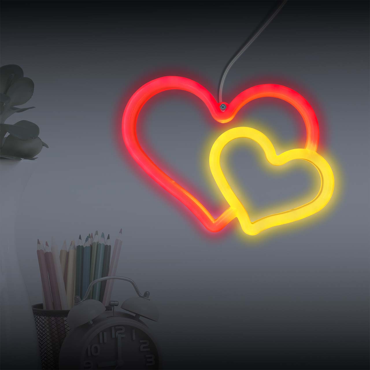 Neonowa lampka LED w kształcie serc to wyjątkowa dekoracja pełna romantycznego klimatu. Doskonała na prezent walentynkowy, do sypialni czy kawiarni. Łatwe zasilanie przez USB, energooszczędna technologia LED i lekka konstrukcja. (IP20, bezpieczne do codziennego użytku).
