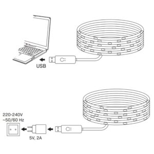 Produkt posiada również tryby muzyczne: światło zmienia się w rytm muzyki. Możliwe są dwa sposoby zasilania: przez gniazdo USB w komputerze, telewizorze lub innym urządzeniu (laptop, powerbank, itp.) lub poprzez zasilacz sieciowy.