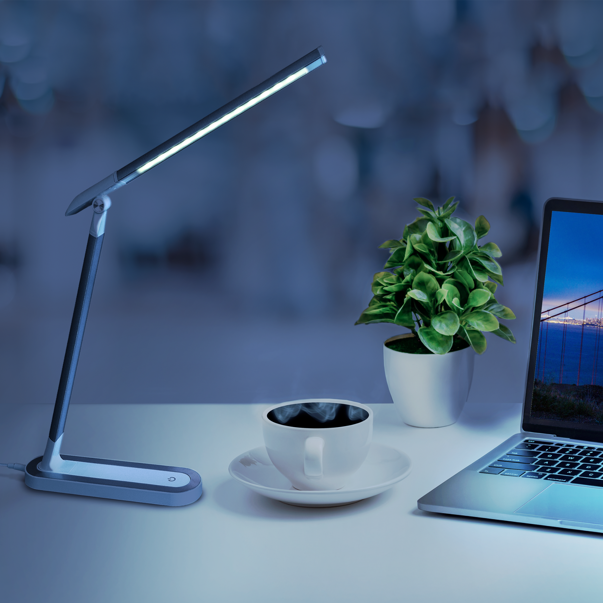 Nowoczesna lampka biurkowa LED wykonana z tworzywa sztucznego przeznaczona do zastosowań mieszkaniowych jak i biurowych.