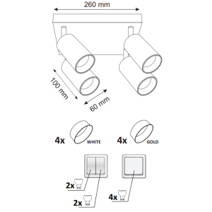 MARIBEL to czteropunktowy, nowoczesny plafon z regulowanym, wymiennym źródłem światła, wykonany z aluminium w kolorze białym. Oprawa posiada osiem pierścieni – cztery w kolorze białym, cztery w kolorze złotym.