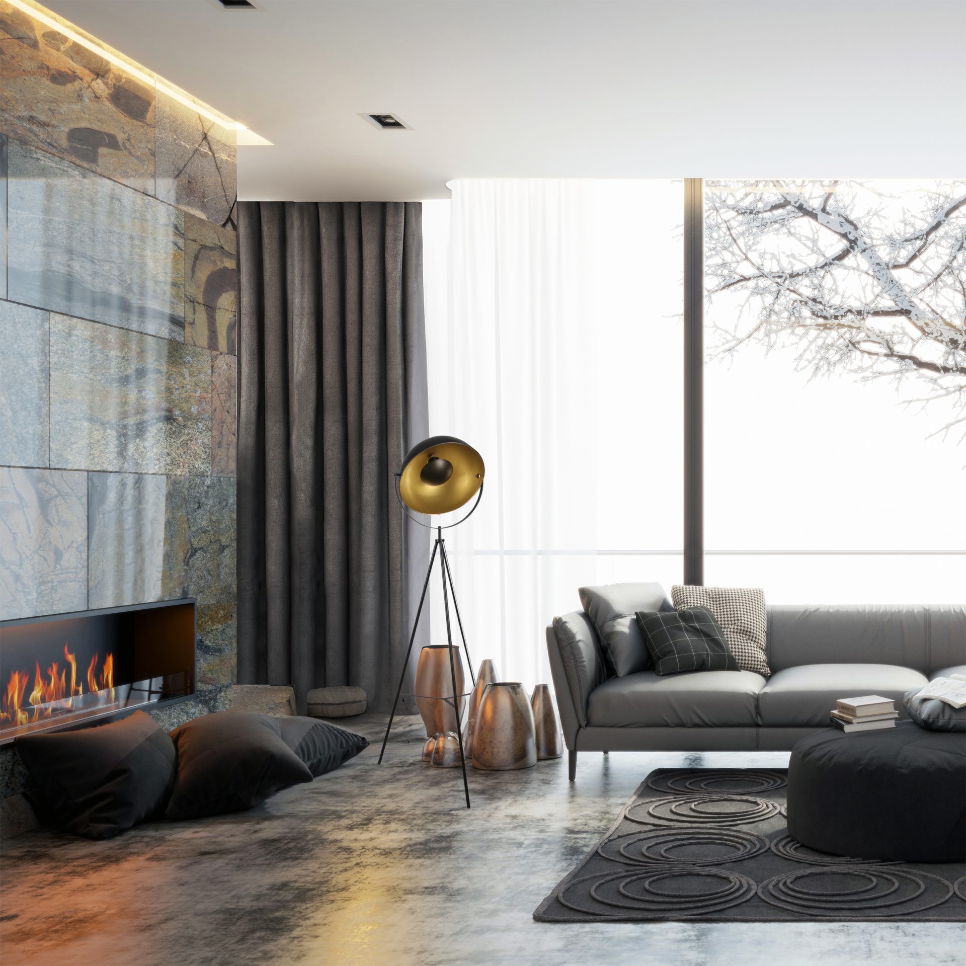 Lampa podłogowa MATYLDA to niezwykle prosta i nowoczesna lampa w kolorze czarnym ze złotym wykończeniem w środku klosza.