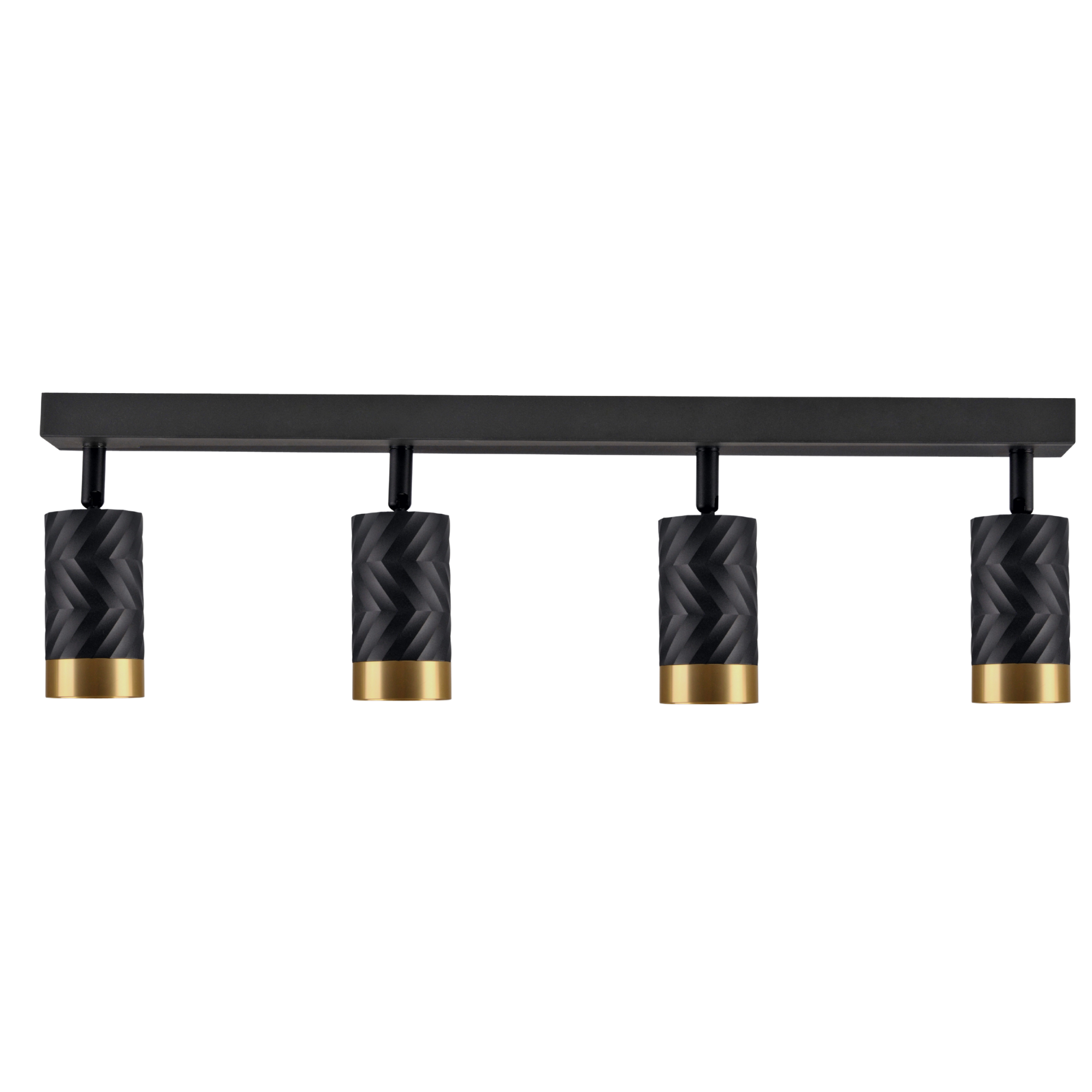 ARRAS to czteropunktowa, nowoczesna oprawa, listwa z wymiennym źródłem światła, wykonana z aluminium w kolorze czarnym, ze złotym odkręcanym pierścieniem.