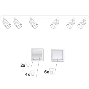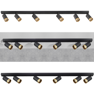 ARRAS to sześciopunktowa, nowoczesna oprawa, listwa z wymiennym źródłem światła, wykonana z aluminium w kolorze czarnym, ze złotym odkręcanym pierścieniem.