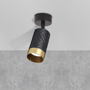 ARRAS to nowoczesna oprawa, spot ścienno-sufitowy z wymiennym źródłem światła, wykonana z aluminium w kolorze czarnym ze złotym odkręcanym pierścieniem.
