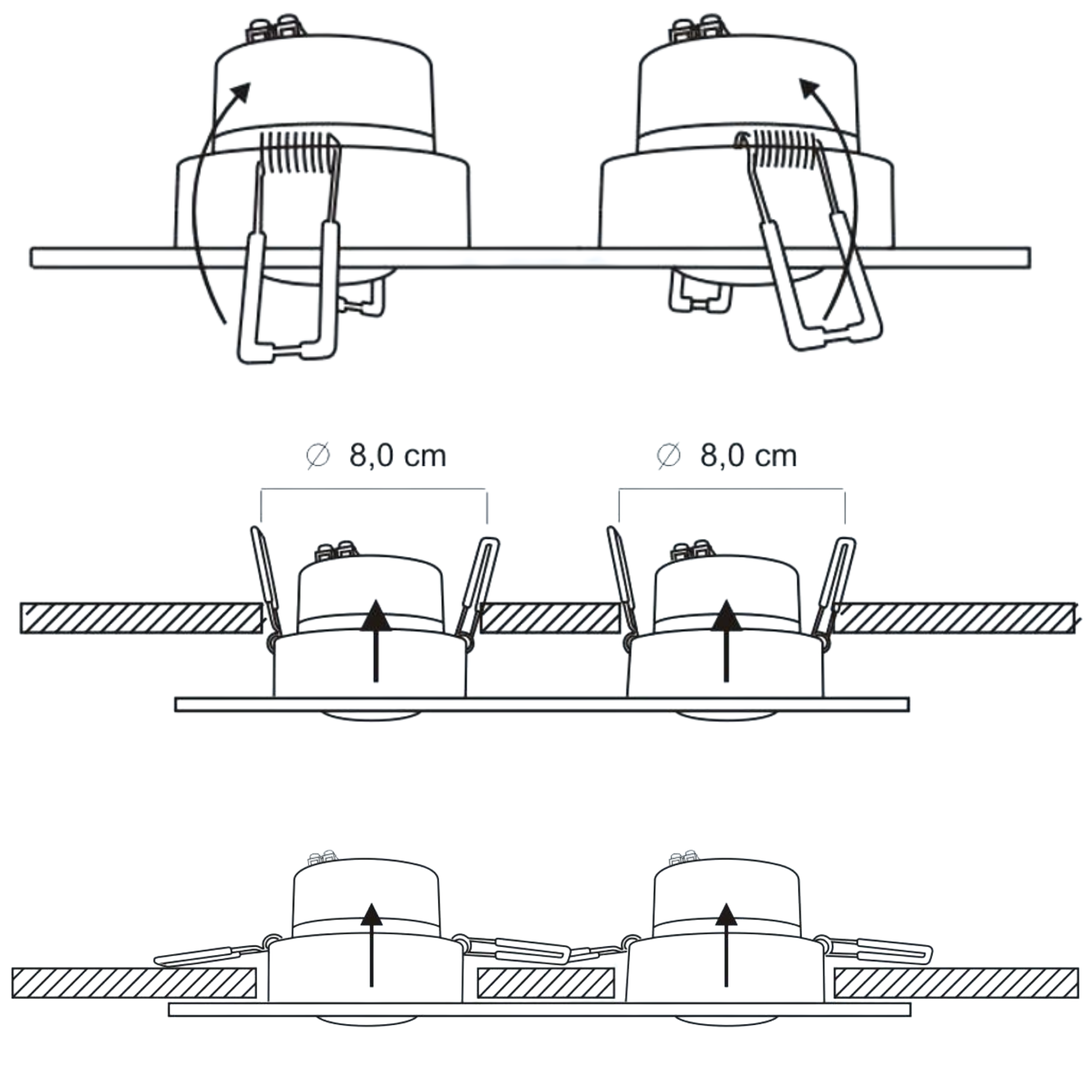 - Oprawę umieszczamy w przygotowanych otworach kierując sprężyny dociskowe w górę