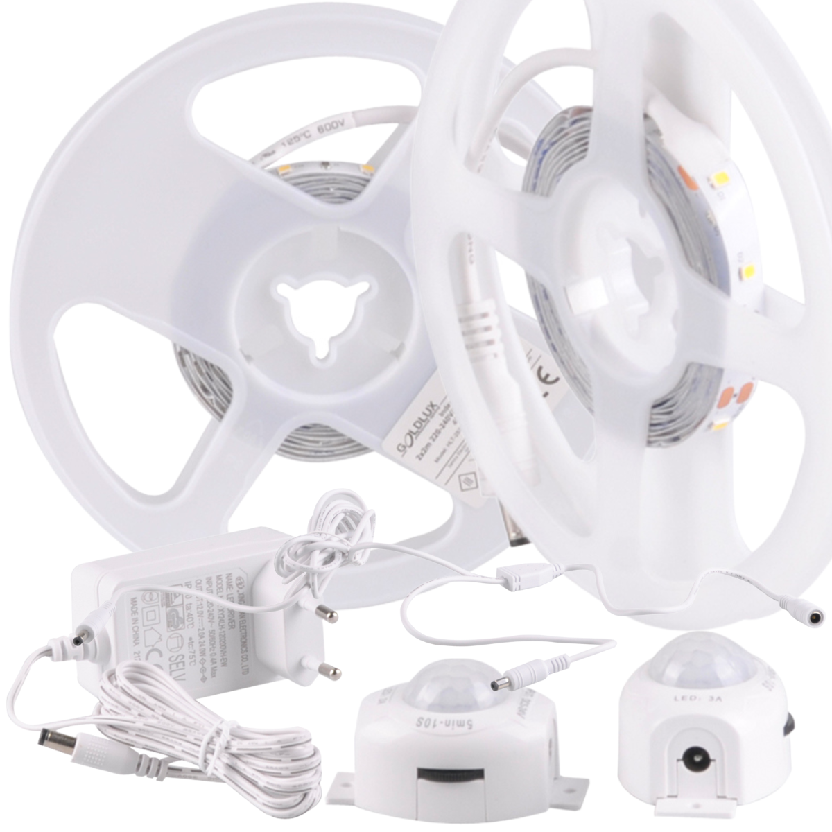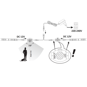 Taśma LED do użytku wewnątrz pomieszczeń. Czujnik ruchu załącza oświetlenie po wykryciu ruchu. Czujnik działa tylko, gdy jest ciemno, natomiast w dzień czujnik nie uruchomi taśmy LED. Czas działania jest wydłużany o kolejny cykl, po każdorazowym wykryciu ruchu. Czujnik nie wyłączy oświetlenia jeśli w zasięgu jego działania znajdują się poruszające obiekty.