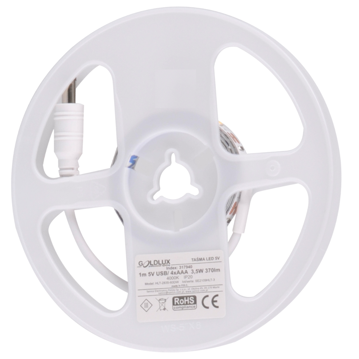 - Port USB 5V: Produkt może być zasilany zasilaczem (1A dla taśmy 1metr – index: 317940 i 5V; 2A dla taśmy 3metry – index: 317957)