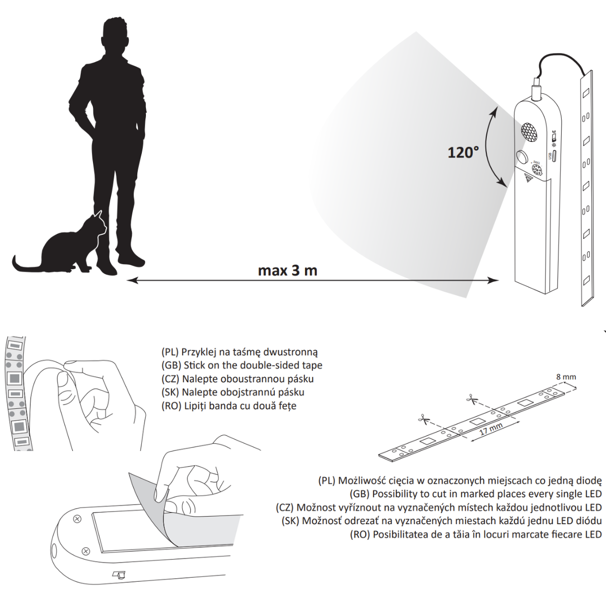 Wyrób użytkować wewnątrz pomieszczeń. Bardzo łatwa instalacja czujnika i taśmy LED za pomocą taśmy dwustronnej. Wyrób wyposażony jest w przełącznik dzień/noc, regulację czasu świecenia i port USB 5V.