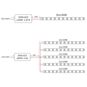 - Do zasilania 5m taśmy z jednego przyłącza zalecamy stosowanie zasilacza do taśm LED 24V; ≥ 48W