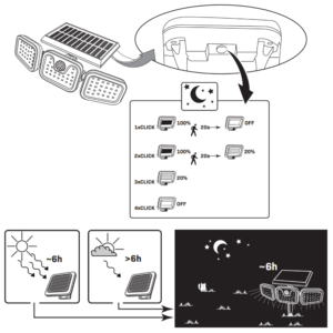 - Czas świecenia po całkowitym naładowaniu akumulatora: max 6h, (mierzono latem, akumulator ładowany w warunkach słonecznej pogody w ciągu dnia)