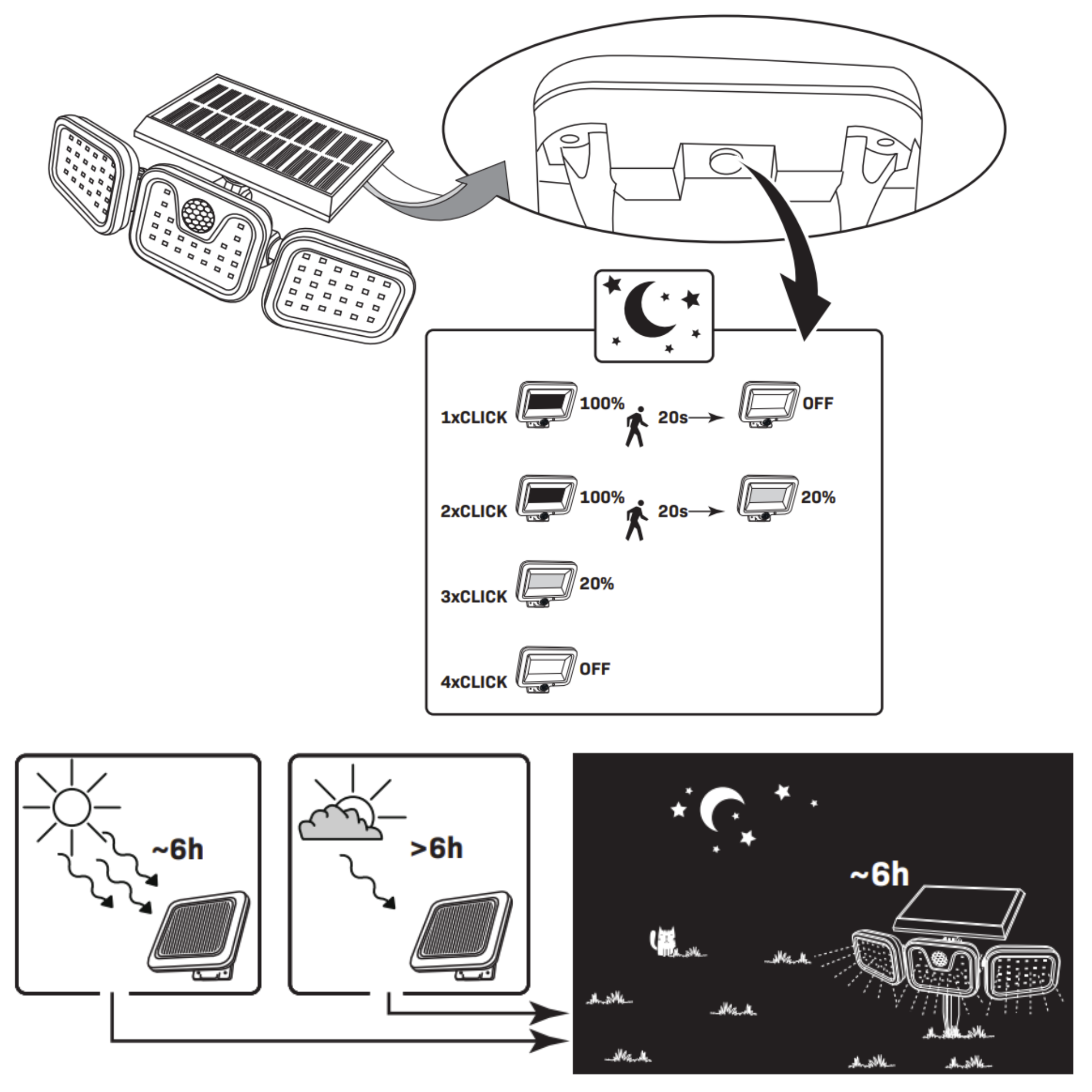 - Wbudowany czujnik zmierzchu – automatycznie włącza lampkę po zmierzchu i po wykryciu ruchu
