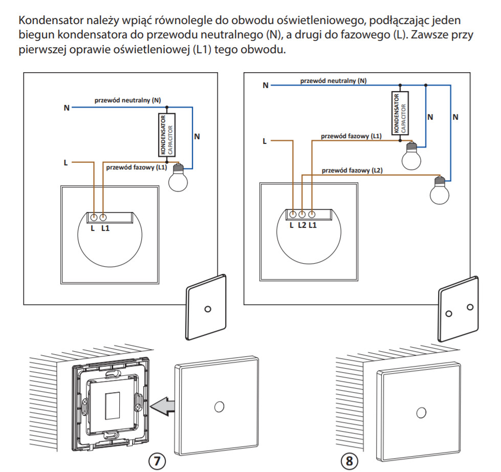Włącznik światła wyposażony jest w kondensator. Instalacja nie wymaga przewodu neutralnego (N). Pozwala to na montaż urządzenia w każdej istniejącej instalacji. Włącznik podświetlany, sygnalizuje przy pomocy kolorów włączenie i wyłączenie światła.