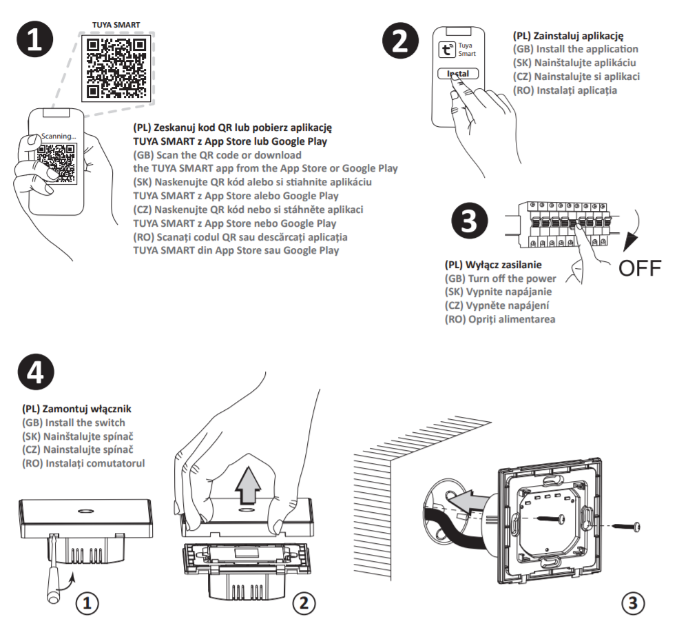 Pobierz aplikację Tuya Smart z Google Play (dla systemu Android) lub App Store (dla systemu iOS), a następnie uruchom ją i zainstaluj według kroków podanych w aplikacji. Możesz również zainstalować aplikację skanując kody QR (znajdują się na końcu instrukcji). W razie, gdyby nastąpiły problemy ze sparowaniem urządzenia z aplikacją, należy zresetować urządzenie. W tym celu przytrzymaj przycisk włącznika znajdujący się na froncie urządzenia przez około 5 sekund i powtórz proces parowania w aplikacji Tuya Smart.