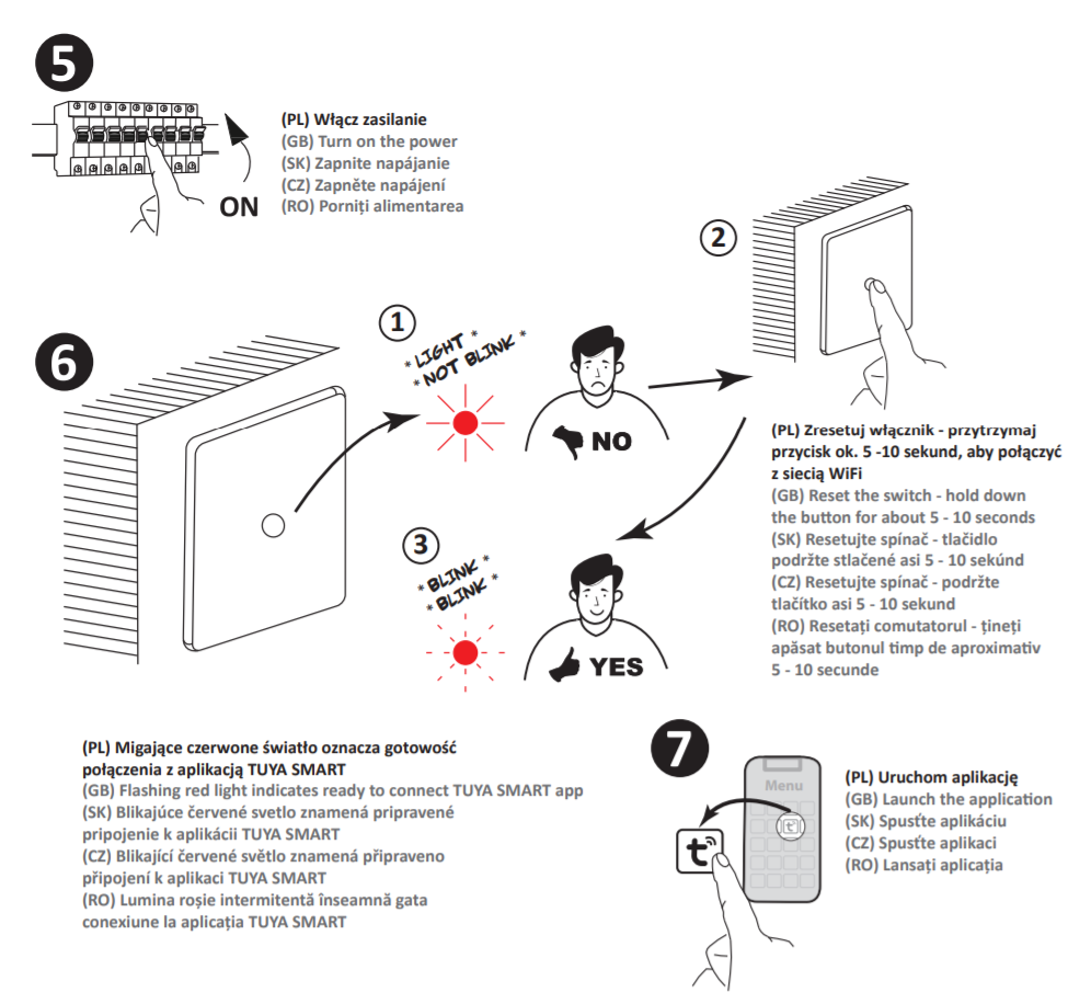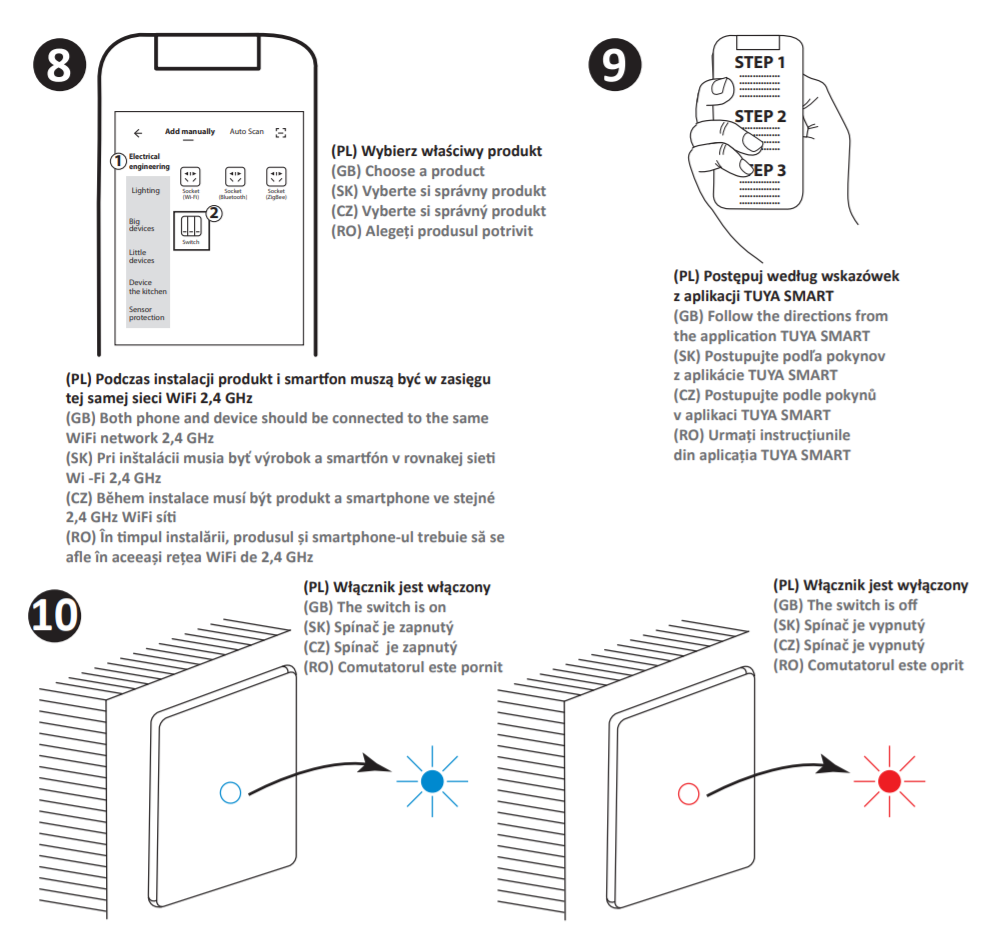 Przed montażem urządzenia w wybranym miejscu należy sprawdzić zasięg domowej sieci Wi-Fi i zapoznać się z instrukcją. Montaż powinna wykonać osoba posiadająca odpowiednie uprawnienia. Wszelkie czynności wykonywać przy odłączonym zasilaniu. Należy zachować szczególną ostrożność. Schemat montażu: patrz ilustracje. Przed pierwszym użyciem należy upewnić się, co do prawidłowego mocowania mechanicznego i podłączenia elektrycznego. Wyrób wymaga przygotowania do działania.