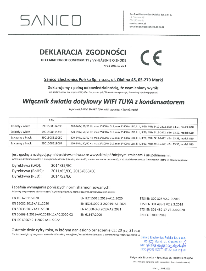 Sanico Goldlux Wi-Fi SMART włącznik dotykowy podwójny czarny z kondensatorem TUYAsmart IP20 – 319067
