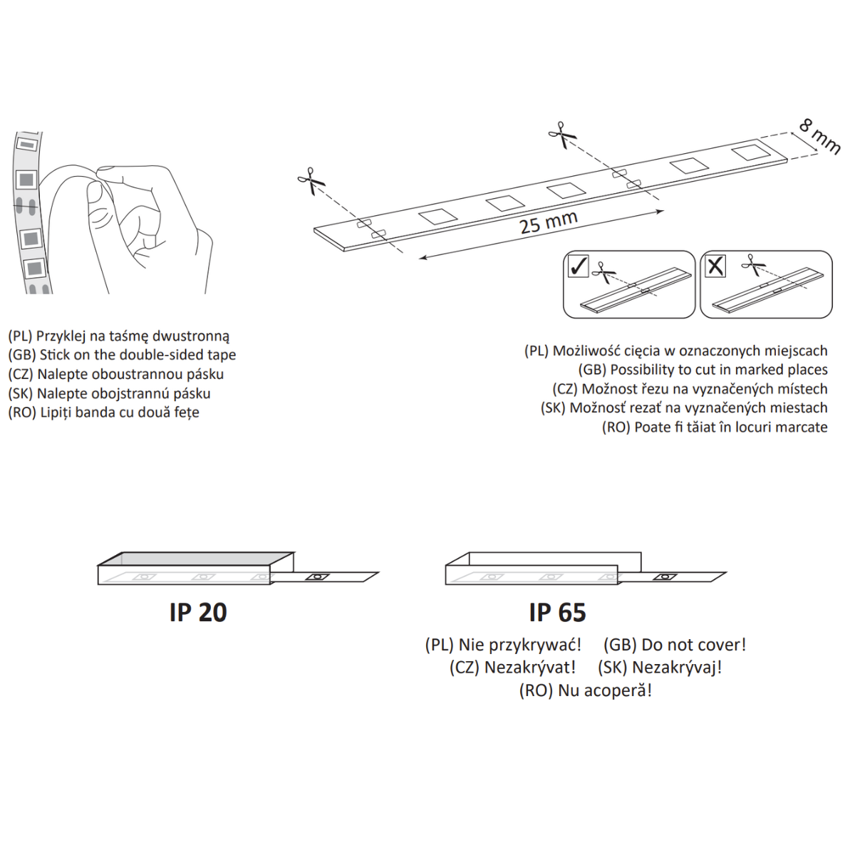 - Możliwość cięcia w wyznaczonych miejscach co 2,5 cm = 3 x LED – miejsce cięcia oznaczone na taśmie LED