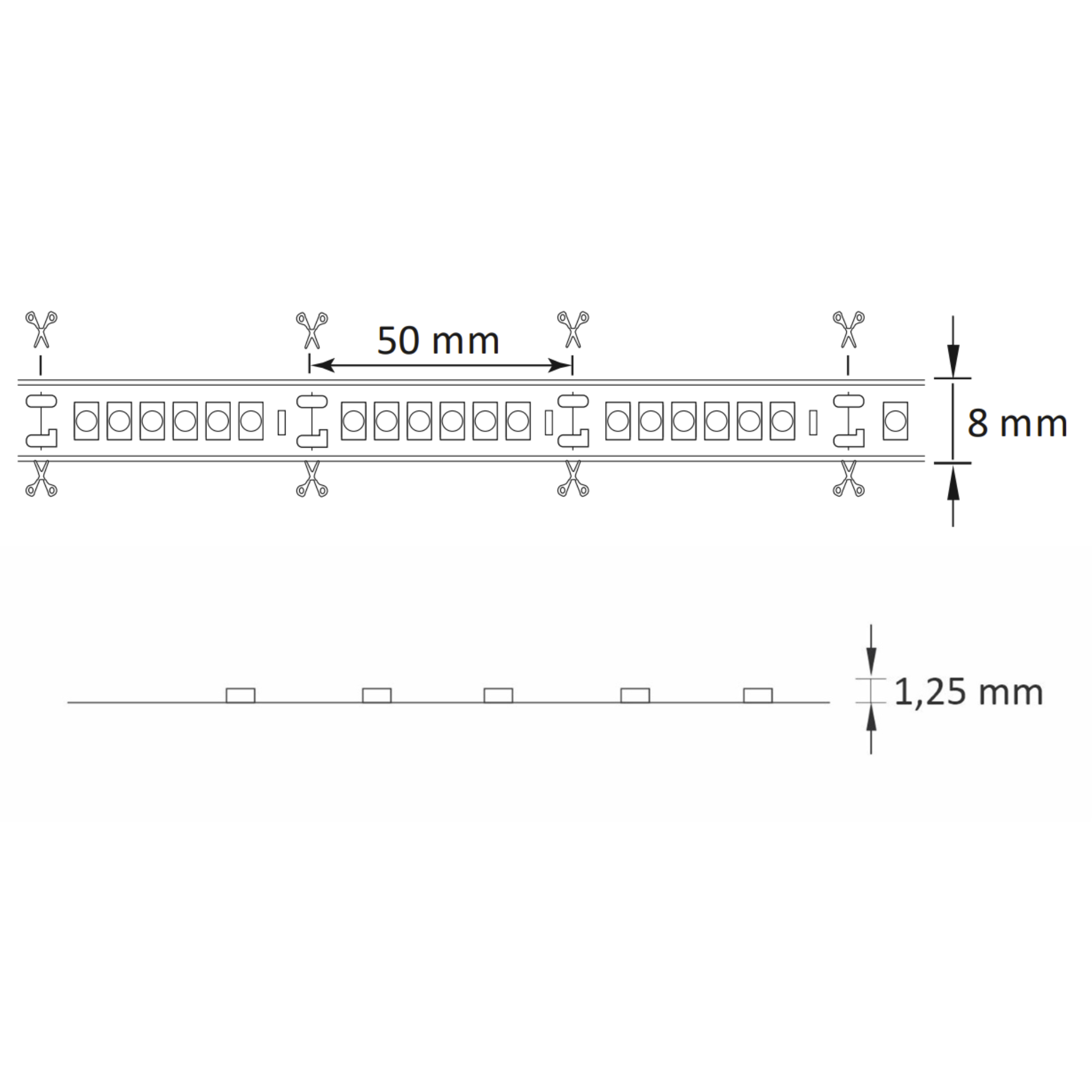 - Możliwość cięcia w wyznaczonych miejscach co 5 cm = 6 x LED – miejsce cięcia oznaczone na taśmie LED