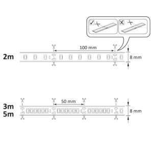 - Możliwość cięcia w wyznaczonych miejscach co 5 cm = 6 x LED – miejsce cięcia oznaczone na taśmie LED