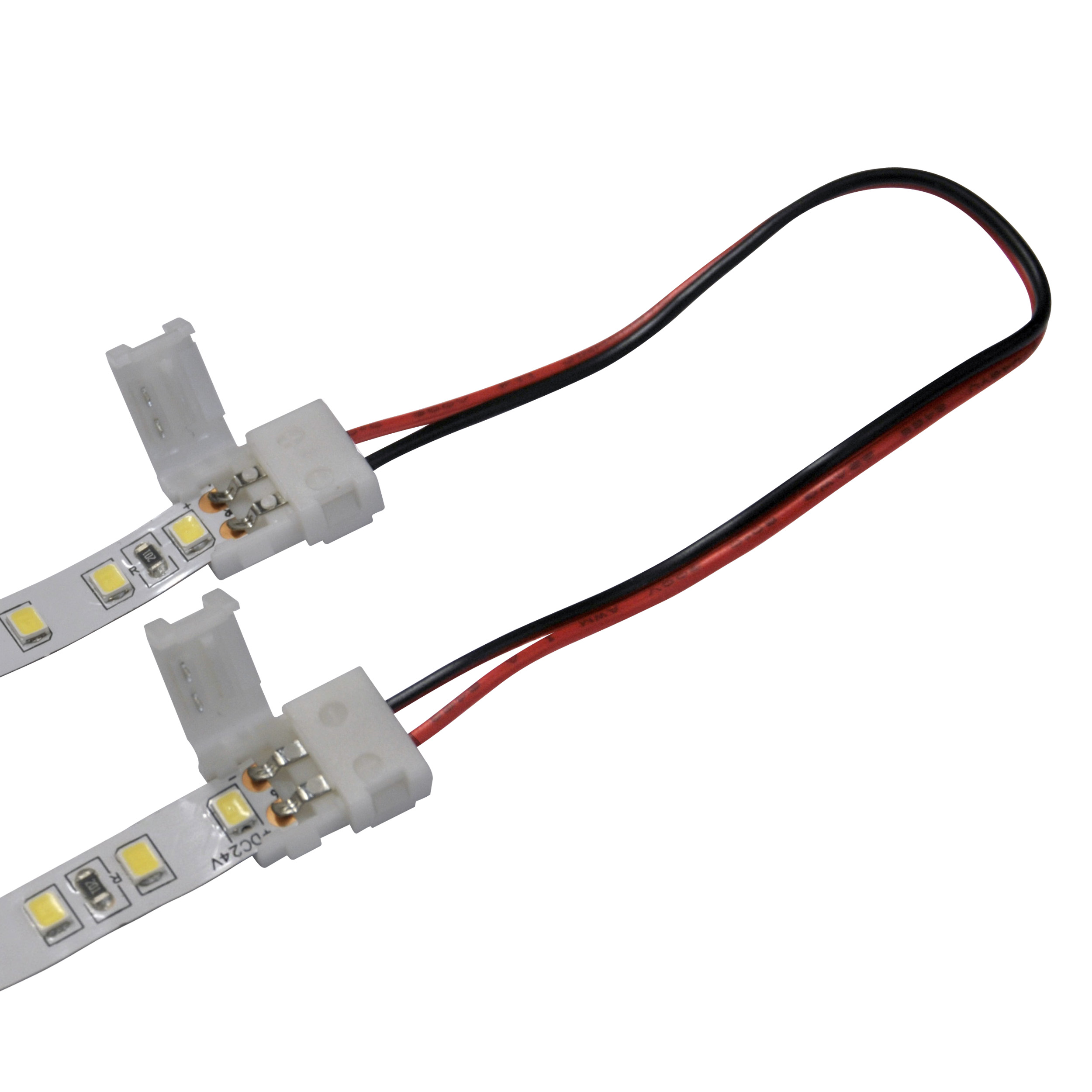 Złączka elastyczna dwustronna umożliwia szybkie podłączenie taśmy LED. Wystarczy umieścić taśmę LED w złączce i zacisnąć. Elastyczny kabel daje możliwość podłączenia ze sobą dwóch taśm, lub też złączenia ze sobą tej samej taśmy np. w narożnikach bez potrzeby lutowania.